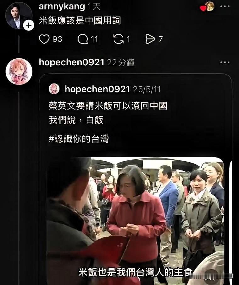 现在的“台独”分子已经癫狂到六亲不认了! 就因为蔡英文说了“米饭”两个字,他们觉得这不是台湾的“习惯用语”,他们就怒喷蔡英文“滚回中国”! 对,你们没看错,就是那个天天喊着“去中国化”、搞分裂的蔡英文,居然因为一个再普通不过的词,被自己的“支持者”追着骂。 咱们普通人平时吃饭,谁不是说“吃米饭”?这三个字简直刻在生活里,结果到了“台独”分子嘴里,就成了“不合台湾习惯”的“原罪”。 他们这哪是讲“习惯”,分明是魔怔了!为了搞分裂,连日常用语都要拿来做文章,恨不得把所有和大陆相关的东西都一刀切,连自己人都不放过。 蔡英文算是把“台独”口号喊得最响的了,结果还是因为一个词“不够独”被喷,可见这些人的脑子已经走火入魔。 老话说“天欲令其亡,必先令其狂”,这些“台独”分子越蹦跶,越说明他们心虚。 连自己阵营的人都能因为一个日常用词翻脸,这种分裂势力根本成不了气候,蹦跶不了几天了。