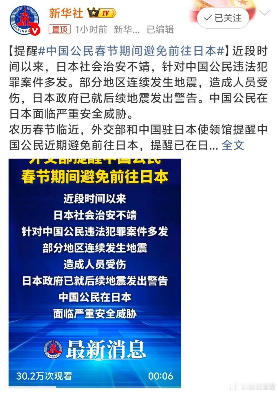 中国公民春节期间避免前往日本咱就是听话,既然日🇯🇵右翼分子不喜欢咱们去,咱还不稀得去呢,祖国也发出警告⚠️,还是不去为妙。看看日🇯🇵右翼的嘴脸中国公民春节期间避免前往日本
