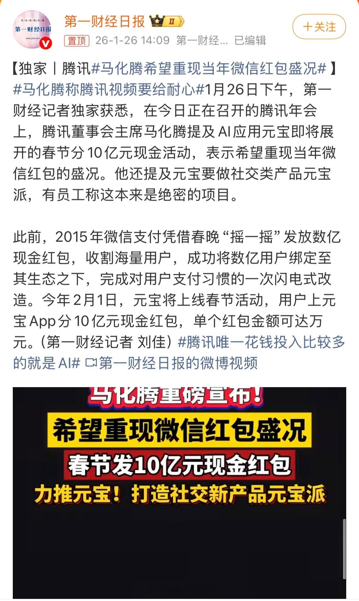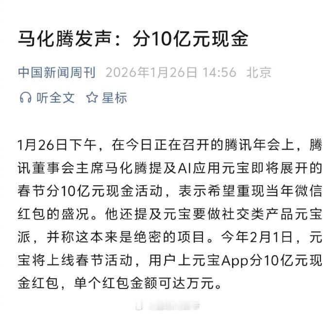 马化腾希望重现当年微信红包盛况 小马哥为腾讯元宝狂撒10亿现金红包元宝、文心、千问、DeepSeek、豆包,都来吧。今年春晚注定将是AI入口争夺大战!
