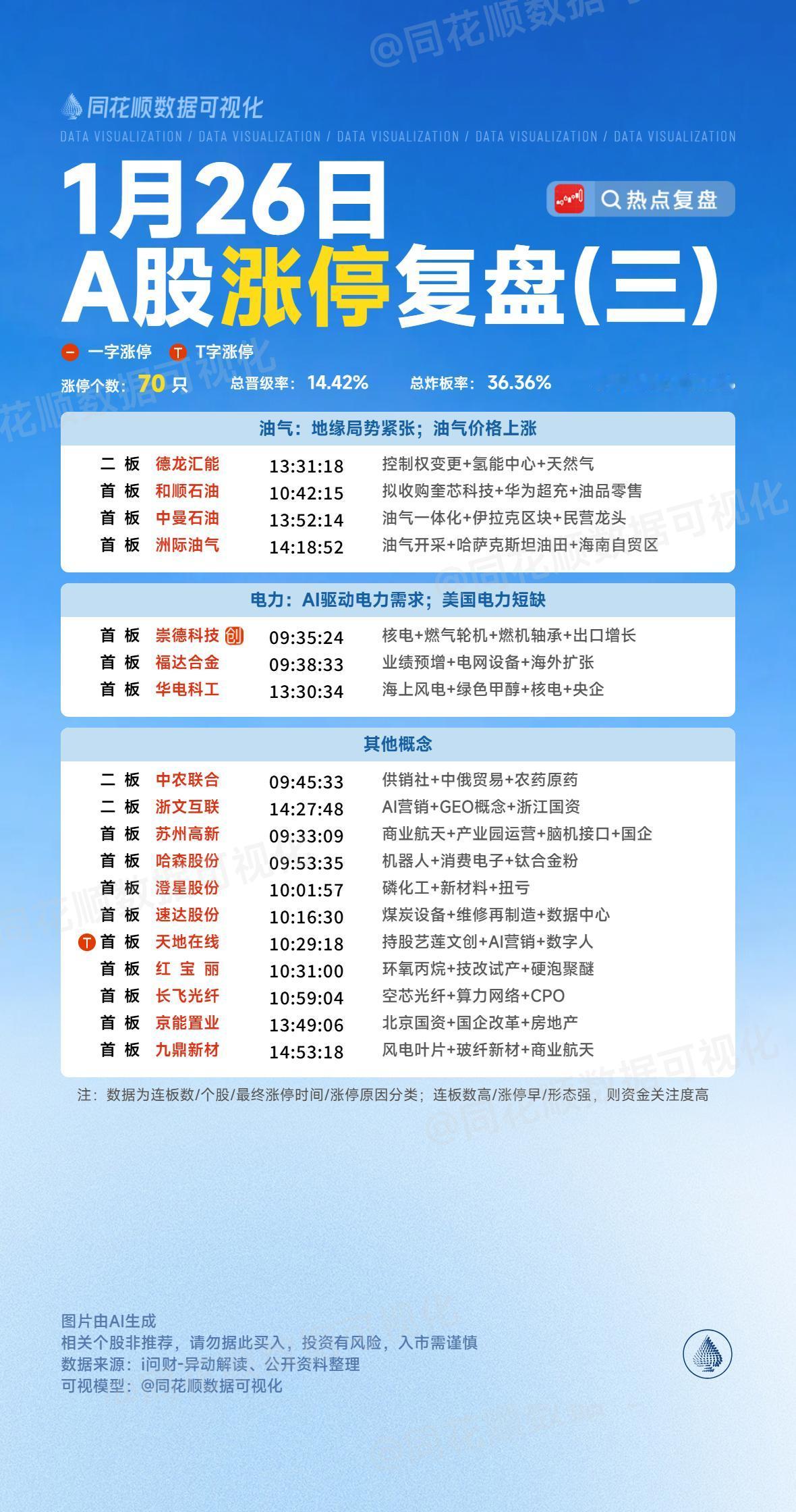 1月26日复盘:白银有色、东方日升、浙文互联、拓日新能、红宝丽隔日走势的一些看法! 1、白银有色(贵金属) 白银价格持续新高,早盘期货仍然是大涨,所以有色在高开后继续向上进攻,但是它整体毕竟在高位,再加上业绩确实难看,所以今天高位分歧非常大,但是架不住白银期货持续大涨,它最终还是顶住分歧走出了强势5连板形态! 盘后的龙虎榜量化大幅卖出,接力的资金并不强,榜单整体净流出近7亿,毫无疑问有色今天的涨停更多的是市场合力的结果,而且整个贵金属情绪非常好,有色情绪涨停也就不难理解了,但是这个方向太依赖期货的强度,期货在连续大涨后还能不能持续很难说,所以说今晚的夜盘期货是重点,一旦继续强势,有色就可能持续表现下去,一旦出现明显回落,那么整个贵金属的炒作也会明显降温! 2、东方日升(太空光伏) 日升竞价大幅高开后在早盘迅速出现承接去封板,但是随着太空光伏的强分歧,它也出现了明显的砸盘兑现,之后就没有资金去承接回封了,最终走出了一个高位炸板的走势! 盘后的龙虎榜两个机构是做T引导,徐晓、低位挖掘买入也超过1个亿,卖盘一个量化卖出2.2亿,中信建投酒仙桥路这个席位卖出1.3亿,是明显的潜伏盘,3日榜中曲江池、紫阳东路很明显也是引导做T,这样的榜单是非常不错的,游资整体锁仓状态比较多,机构持续做T引导,再加上太空光伏今天虽然有分歧,但是相比于商业航天的负反馈要要好很多,隔日一旦出现修复,日升出现趋势冲高概率还是比较大的,而且太空光伏这个方向的走势和之前的电网设备非常类似,一旦板块回暖,这些前排个股继续走出正反馈的概率是非常大的! 3、浙文互联(AI应用) 浙文竞价超预期开出一字板,但是开盘整个AI应用方向是强分歧,很快出现资金砸盘兑现,浙文虽然整体承接非常强,但是多次炸板后并没有资金强封了,直到午后在AI方向情绪回暖时才有资金回封,最终走出了一个高位放量连板形态! 盘后的龙虎榜买盘成都系加仓8千万,新入场还有东莞武汉和量化,卖盘作手新一止盈离场,稼先路卖出大部分筹码,这是典型的资金接力换手榜单,而且从它午后封板力度看还是非常强的,再加上它今天高位筹码置换比较充分,隔日竞价一旦出现明显弱转强,还是非常有看点的,而且毫无疑问浙文是AI方向近期最强势的个股,一旦板块出现修复,它也是最可能加速的,而且它的新高表现是比较能够吸引资金去做二波行情的! 4、拓日新能(太空光伏) 拓日是今天太空光伏唯一最终走出一字板的个股,这说明资金做多的情绪非常强,而随着钧达的断板,它毫无疑问成了太空光伏方向的情绪龙一! 盘后的龙虎榜是3日榜,成都系买入1.5亿,其余几个席位都是2千万左右买入,卖盘几乎没有抛压,这个榜单确实太一致了,从今天它的表现看,资金做多意愿是非常强烈的,拓日的表现有点类似电网设备的汉缆,一旦隔日继续强势一字板,对于太空光伏的修复会起到很大的促进,但是它毕竟连续缩量,而且隔日面临新高,如果板块开盘不是特别强势的话,它或许会出现很大的抛盘,开盘能不能顶住分歧会是一个非常大的看点,毕竟它前面不久就是连续两个缩量涨停后出现近天地板的兑现形态! 5、红宝丽(化工) 红宝丽竞价出现明显高开,再加上今天早盘商业航天、光伏都出现分歧下杀,化工方向反而出现一定板块效应,红宝丽在高位放出一定量能后有资金去强势封板,而且封单非常强势,最终稳稳的封死涨停到尾盘! 红宝丽这个涨停是典型的N型上攻形态首板,而且整体趋势非常好,再加上它辨识度非常高,所以虽然化工方向整体板块效应不是很明显,红宝丽依然能够独立走出强势表现,而且这只个股流通市值并不高,是很适合资金持续接力的,所以它虽然没有特别强的板块效应,但是它可以走出类似山子的表现,而且相比于山子,它的优势更为明显,而且它整体位置并不高,接下来只要有资金持续引导,它走出超强表现还是比较值得期待的,但是这只个股毕竟是缩量涨停,隔日不开一字板的话抛压会很大,所以开盘一旦大幅高开,出现明显资金砸盘的话就要注意兑现的风险,但是如果板块出现明显共振,红宝丽之后的趋势还是比较值得期待的! 本文只限于分享和交流,不构成投资建议,股市有风险,投资需谨慎!