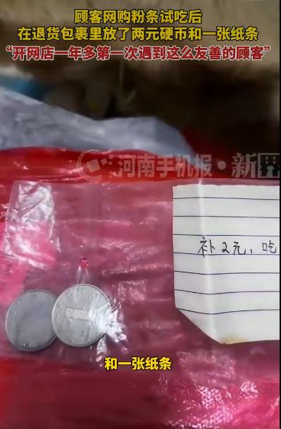 一位顾客网购粉条试吃后,主动在退货包裹里塞了两元钱,还附了张纸条解释原因。这事儿听着不大,却让不少网友直呼“被治愈了”,咱们来唠唠这背后的温情细节。 事情是这样的:有位顾客在网店买了包粉条,收到货后拆开尝了一点,觉得不合口味,就按流程申请了退货。按说退货这事儿挺常见,但这位顾客的做法却让人意外他把粉条重新打包好,塞进退货包裹时,特意放了个小塑封袋,里面装着两枚一元硬币,还附了张手写纸条,上面写着:“试吃了一点,补两元钱。”店主拆包裹时看到这一幕,直接愣住了,开网店一年多,头一回遇到这么实在的顾客。 这事儿之所以戳中大家的心,关键就在“主动补钱”这个细节上。按常理,网购试吃后退货,商家一般也不会追究那点损耗,毕竟商品开封后确实影响二次销售,顾客选择退货,商家大多默默处理。但这位顾客没想着占便宜,反而觉得“吃了人家的东西,得给钱”,哪怕只是两块钱,也要明明白白补上。这种“不贪小利”的真诚,像极了小时候在邻居家蹭了块糖,回家非要让妈妈送点水果回礼的纯粹不是怕被说,而是打心眼里觉得“该这么做”。 店主的反应也特别有意思。他说看到纸条和硬币时,第一反应是“暖”,接着就想起自己开店这一年遇到的形形色色的顾客:有人收到货后挑刺儿要补偿,有人因为物流慢直接给差评,像这样主动补钱的,真是头一遭。这种对比下,两元钱的价值早就不在“钱”本身了,它更像一面镜子,照出了人与人之间最本真的善意我不占你便宜,你也不必防着我,咱们坦坦荡荡做买卖,多好。 其实类似的暖心事儿,网上还真不少。比如之前有毕业生在沙县小吃吃饭,店家看她们边吃边聊求职,悄悄退了13元饭钱,备注“加油,免单”;还有商家因为多收了打包费,被顾客举报后不仅整改,还主动退一赔三。这些故事里,主角们或许素不相识,却都因为“替对方着想”的小举动,让陌生人之间的温度多了几分。 回到这位塞两元钱的顾客,有人说他“太实在”,也有人觉得“没必要”。但换个角度想,如果每个人都愿意为“试吃”补两元,为“麻烦”说声谢谢,为“疏忽”多份理解,那网购时因为退换货起的争执,是不是会少很多?商家和顾客之间,或许就能少些防备,多些信任毕竟,谁不喜欢和“不计较”的人打交道呢? 两元钱很小,小到掉在地上可能没人捡;但两元钱又很大,大到能装下一个人对“公平”的坚持,对“善意”的回应。这样的故事,多来几个又何妨? 来源:齐鲁晚报