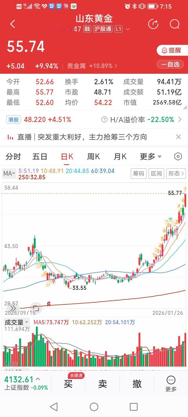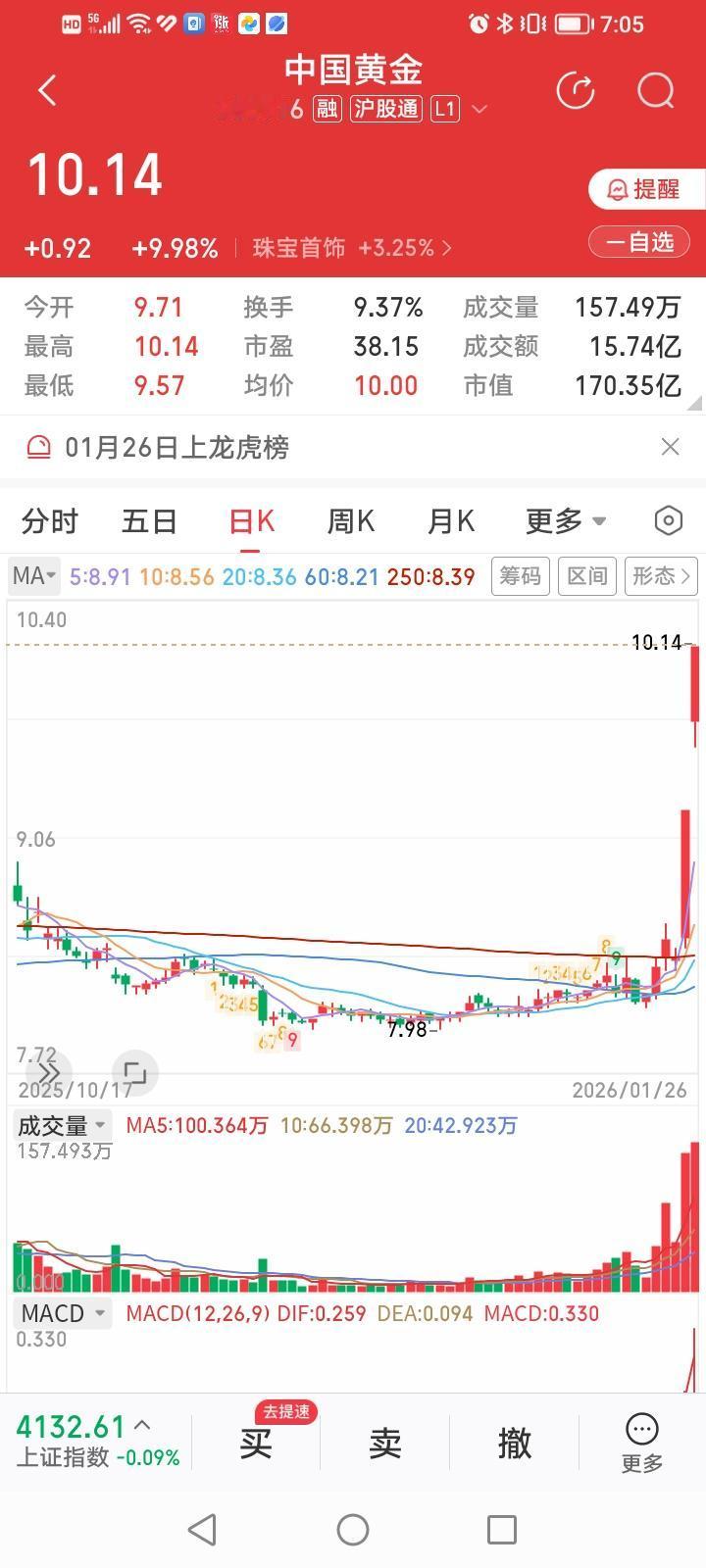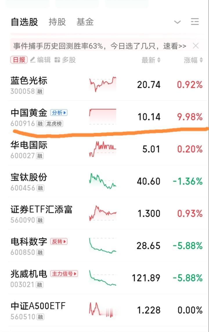 是金子总会发光的!山东黄金股价早就启动并大涨了,咱还纳闷为啥中国黄金股价就不涨呢? 前几天就把中国黄金放进了自选股,当时中国黄金才8元左右,当时左看右看,虽然中国黄金股价不高,但市盈率高达30多倍,就没敢建仓。 谁知中国黄金冲上年线后,股价竟然连涨两个停板。咱又踏空了。 看来资金满盘在寻找价值洼地啊。在低位的好股票早晚会涨的。这就是牛市的主要特征。