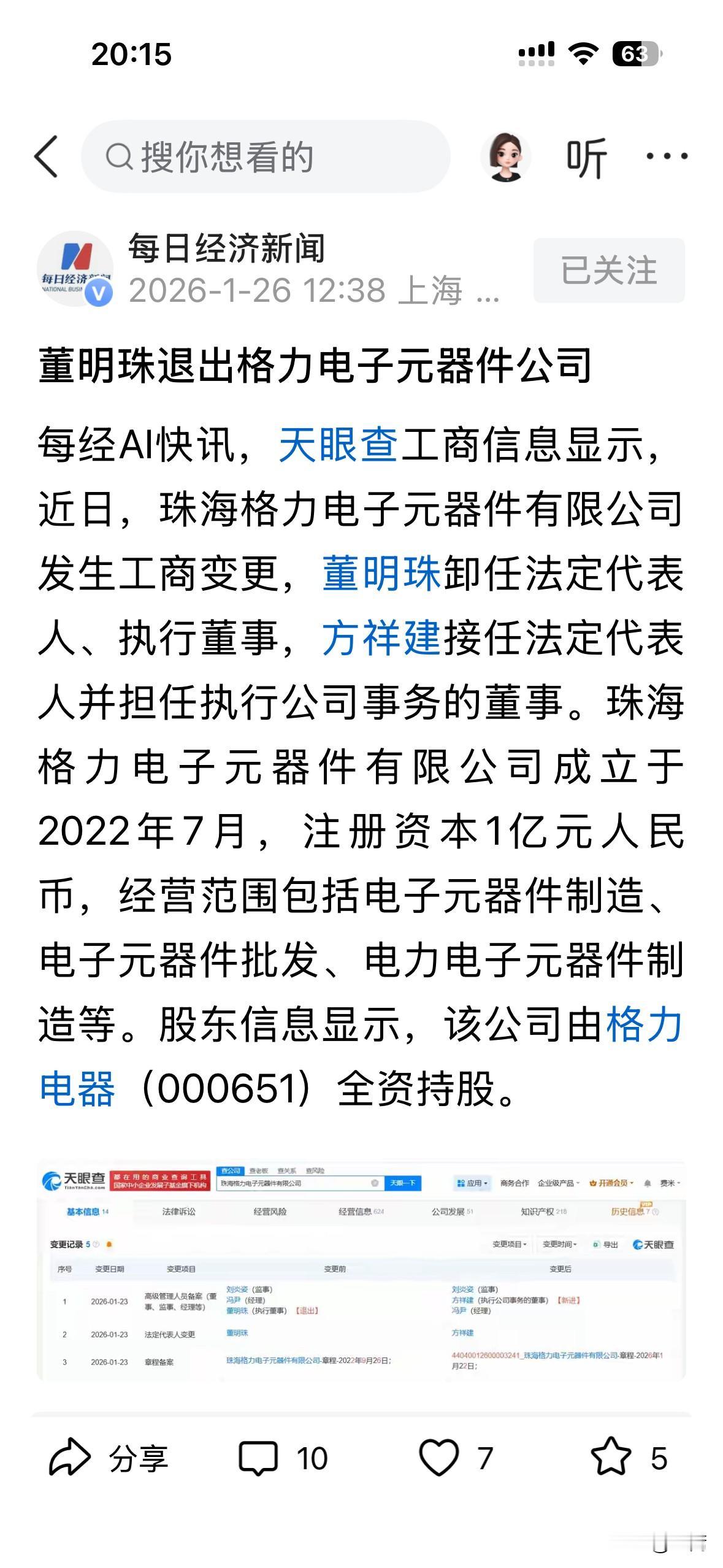 1. 董明珠只是卸任了一家子公司的法人代表,她还是格力电器的董事长,对集团的控制力没变。 2. 接任的是方祥建,他是格力内部培养的年轻干部,这次调整是为了让管理层更年轻化、专业化。 3. 这家子公司主要做电子元器件,包括芯片、功率器件等,是格力在半导体领域的重要布局,业务没变,还是全资控股。 4. 对普通消费者和投资者来说,这事儿影响不大,不用过度解读,格力的整体战略和发展方向不会因此改变。 总之,这就是一次正常的公司内部人事调整,董明珠还是格力的“一把手”,格力的发展方向也不会变。