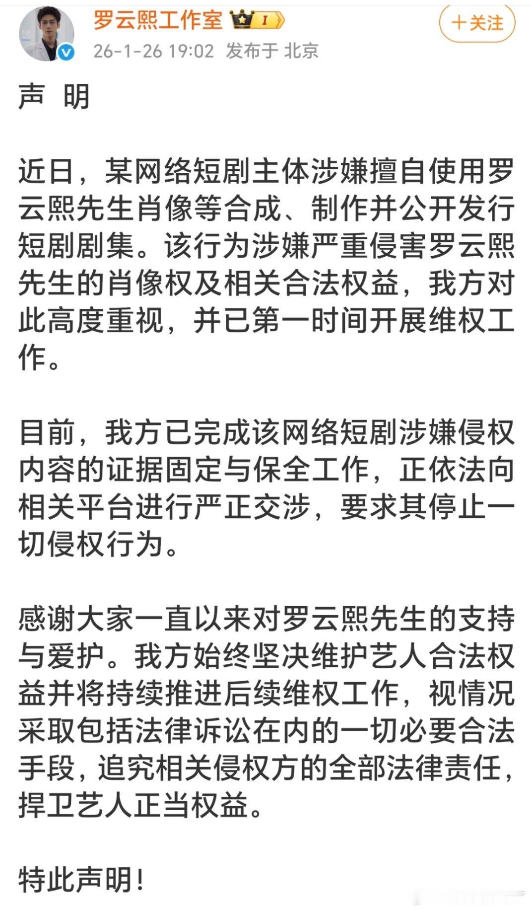 罗云熙工作室发布维权声明短剧真的要整治了,一些短剧制作方就是为了流量、利益无视法律支持维权