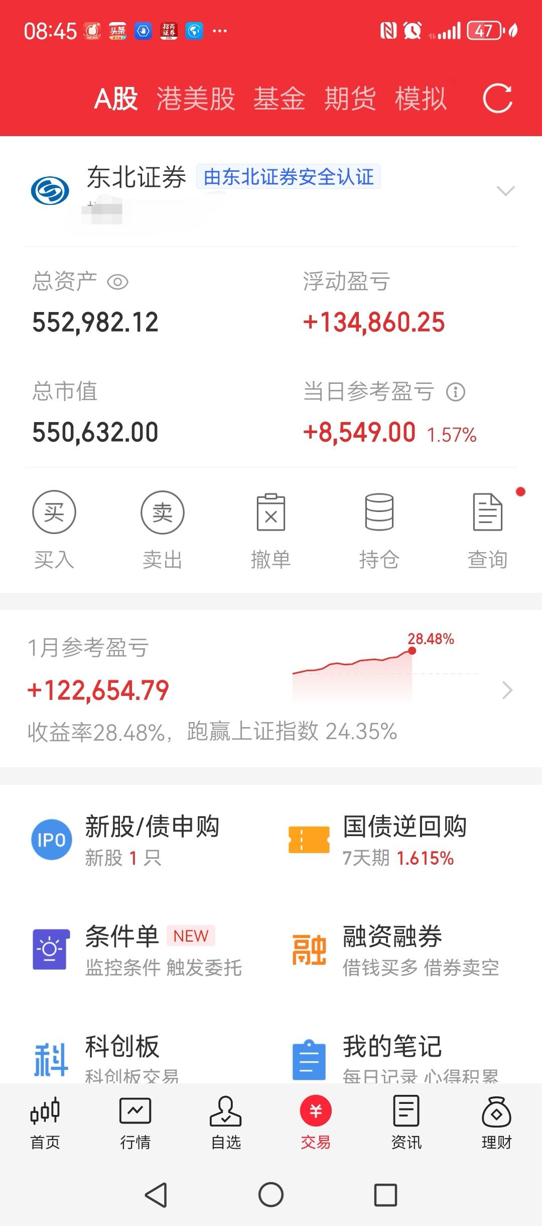 这个账户1月份的收益率达到将近30%。今天在整个市场震荡相对比较大的情况下,收益率依然逆势加速,表现还是非常出彩的。 这得益于持股当中有半仓属于稀有金属板块,这个股票持有将近4个月,收益率接近70%,非常可观。 另外一个股票是刚刚买入不久,微微浮亏,但前景也是一片光明。 我不是做短线的,不会在乎市场短期的震荡和波动。 我的理念是,好价格买入好股票,不赚钱不卖,甚至不赚大钱不卖。