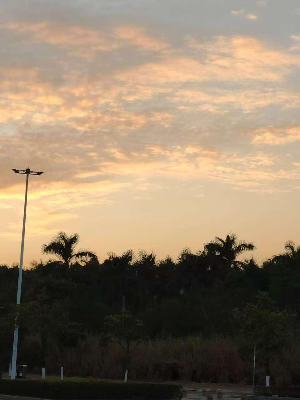 下班刚走出公司大门,一抬头就被眼前的晚霞给撞了个满怀。 天上的云像被撒了一把橘子糖,粉粉黄黄的铺得满世界都是。路边的椰子树都变成了黑剪影,在暖乎乎的光里晃悠。我掏出手机一顿猛拍,手都有点抖。 这一天的累,好像都被这温柔的晚霞给揉没了。风里带着点青草味,吹得人懒洋洋的。走着走着,脚步都放慢了。 原来幸福这么简单,就是下班路上刚好遇见一场不期而遇的晚霞。