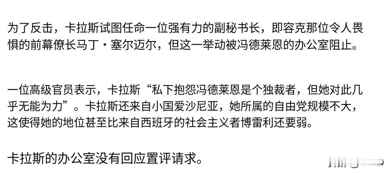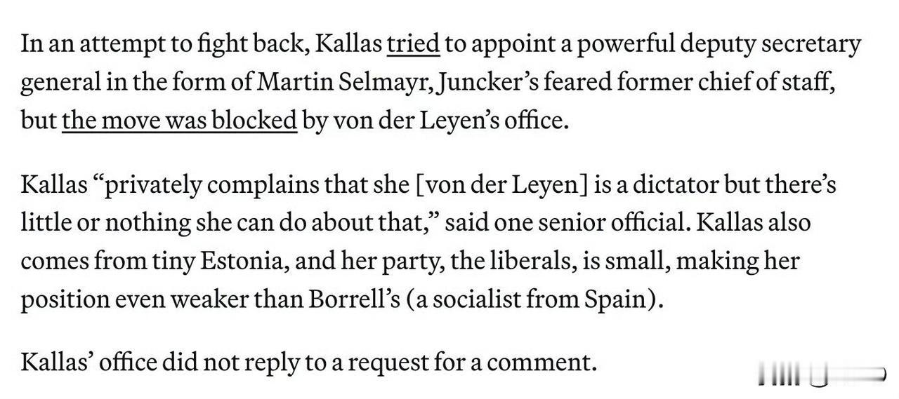 欧盟外交负责人卡娅·卡拉斯私下称冯德莱恩为“独裁者”。来源:politico