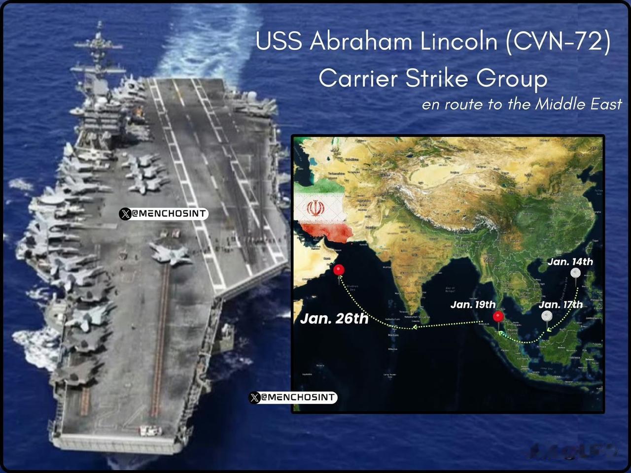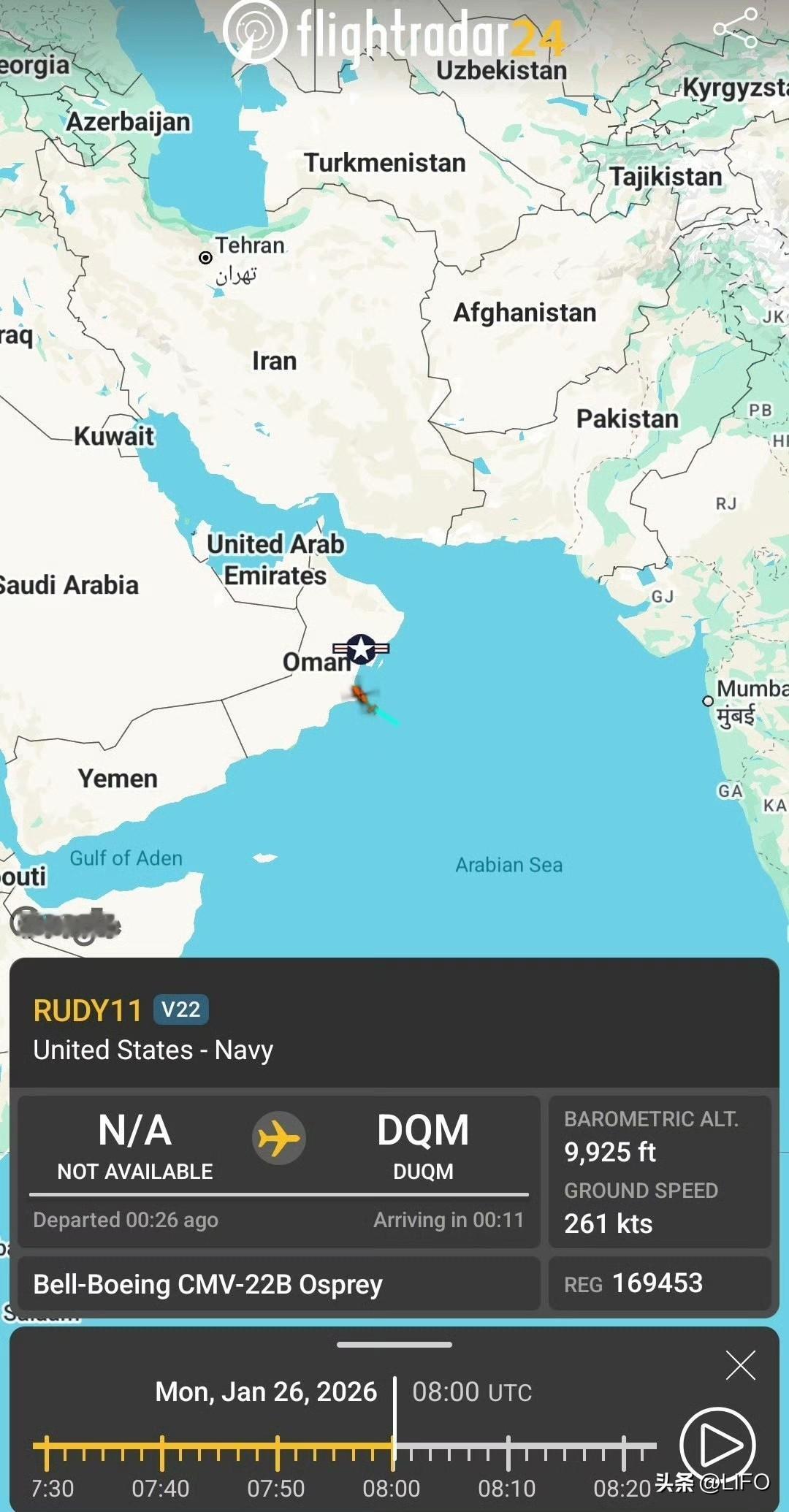 1 月 26 日,美国海军亚伯拉罕·林肯号航母(CVN-72)已抵达阿曼海岸附近。F24数据显示:确认发现隶属该舰队的注册号为 169453 的 CMV-22B 鱼鹰运输机。它目前的位置足够接近伊朗,在加油机支援下可发动攻击。