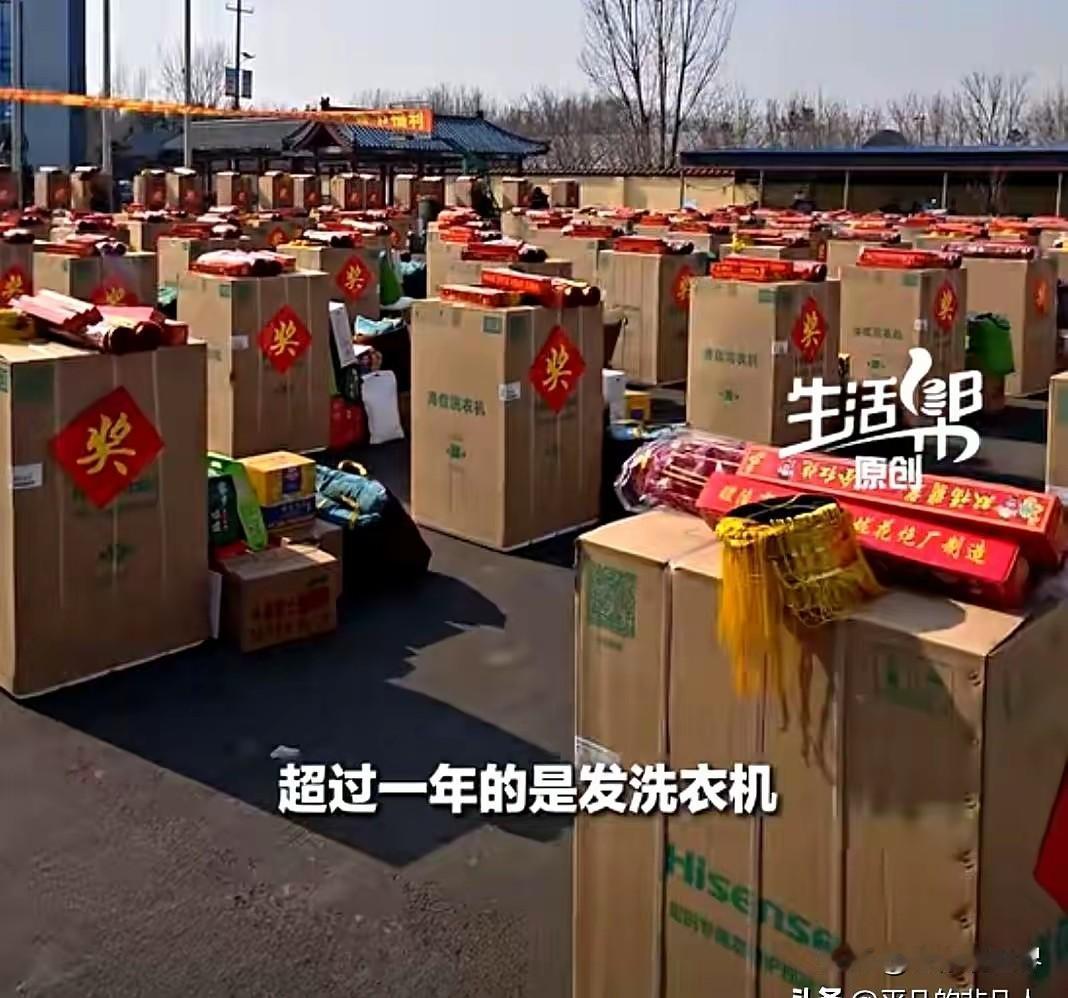 山东临朐。某食品厂发年货了,只见院子里满满当当的堆满了各种礼品,有冰箱电视洗衣机