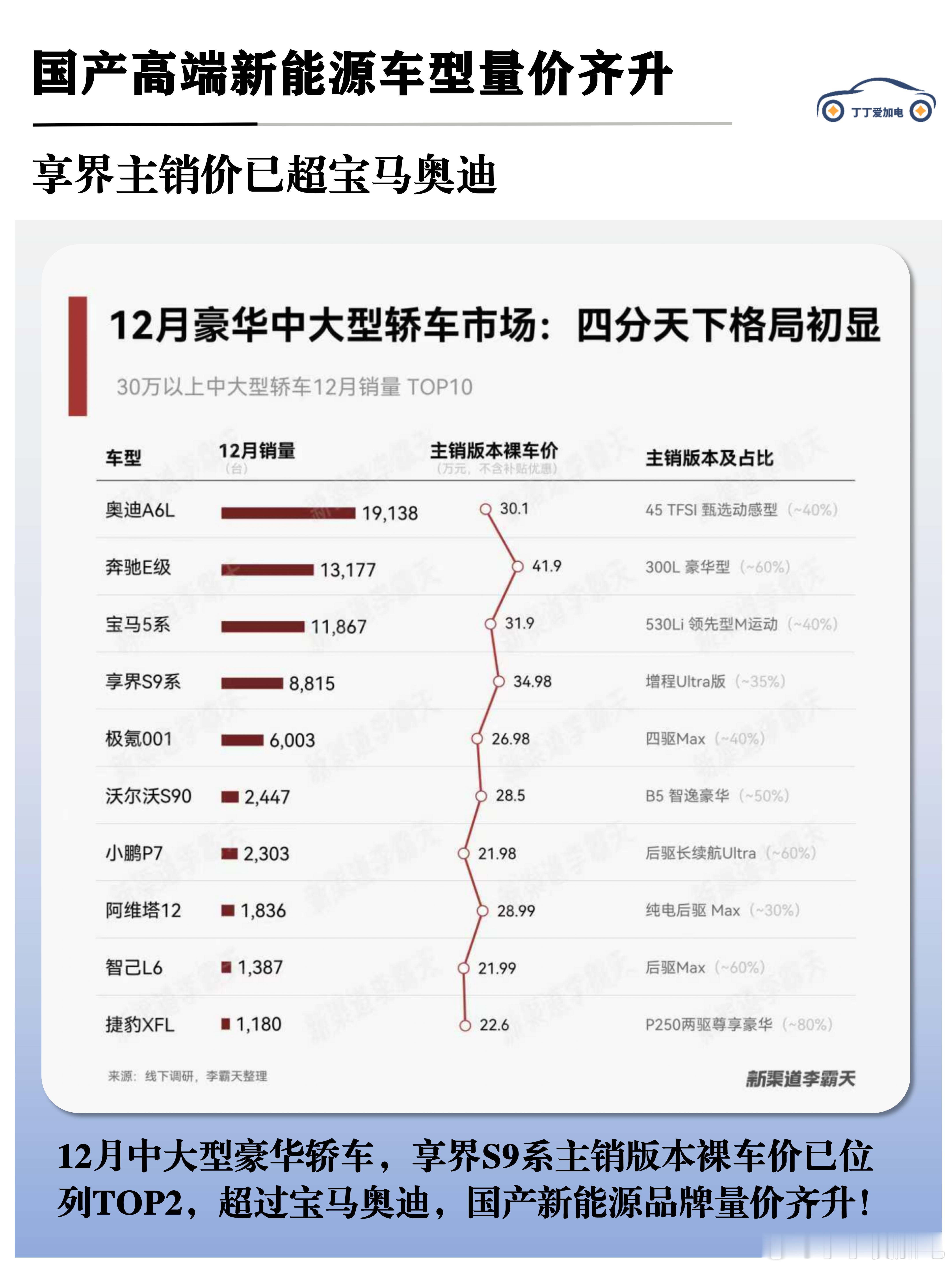 12月销量黑马!享界成交价已赶超宝马奥迪?25年12月汽车销量榜公布,在一直由传统豪华品牌牢牢占据的30万以上中大型轿车榜单中,国产新能源品牌享界已连续稳坐第四,紧跟BBA。不仅如此,享界主销价已经超过奥迪A6L和宝马5系,位列TOP2。这不止是数字的变化,更像一个信号:中国用户对“豪华”的理解,正在重塑。1.需求内核变了:“悦己”成为新共识曾几何时,这个级别的选择几乎是“单选局”。选择BBA,是选择一种无风险的社会认同。但如今,用户开始追问:除了品牌光环,车辆能否满足大家对智能、舒适、审美和全场景体验的综合期待?豪华,正从外在的身份徽章,加速转向内在的自我取悦。这可能也是享界能快速闯入主流视野的关键,它率先回应了这种变化。2.破局靠什么?硬核体验是唯一真理在这个价位,任何故事都需要极致的产品力来承载。成功站稳的车型,通常做对了几件事:首先配置必须得舍得给,空悬、副驾零重力…这些在BBA上需要反复斟酌的选配单,都变成了“标配”。其次,场景切入上,传统豪华车基本都比较商务或中庸,更多照顾对外的感受。而市场上缺少的正是高颜值、多场景、给足情绪价值的豪华车。同时也得有和传统豪华车不一样的东西,那就是科技和智能化,辅助驾驶、智能座舱等豪华科技配置,是中国新能源车的独特优势。3.销量背后:一场对BBA腹地的“渗透战”12月数据显示,在30万以上中大型轿车市场,传统三强(56E)地位依然稳固,但第四名享界S9T 7186辆的销量与市场热度已不可小觑。尤其值得注意的是,这不仅仅是多了一个选择,更预示着:一个曾经高度封闭的市场,其壁垒正在被新的价值主张渗透。第三方机构杰兰路的调研报告也佐证了这种变化:部分中国高端新能源品牌的“品牌档次指数”已与BBA同属豪华阵营,享界S9T获得2025年度下半年用户净推荐值(NPS)中大型轿车第一,口碑超传统豪车。当新豪华的体验不断叠加,你会继续为传统品牌买单,还是转向体验驱动的新选择?欢迎评论区聊聊~享界s9t享界s9奔驰e级宝马5系奥迪a6l