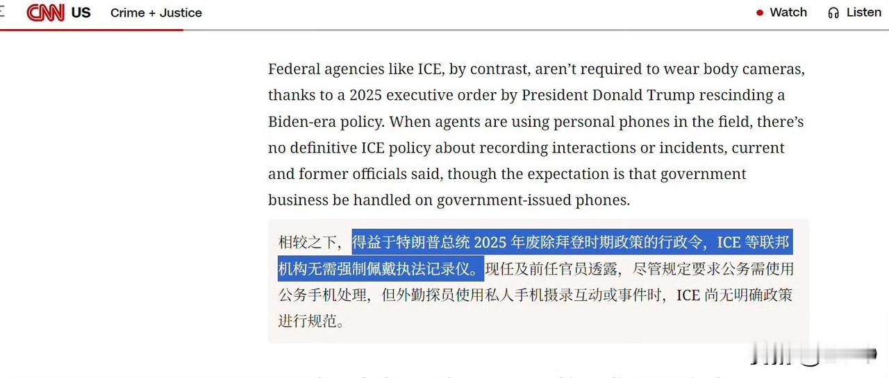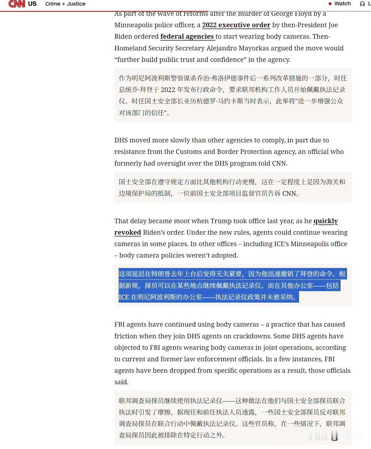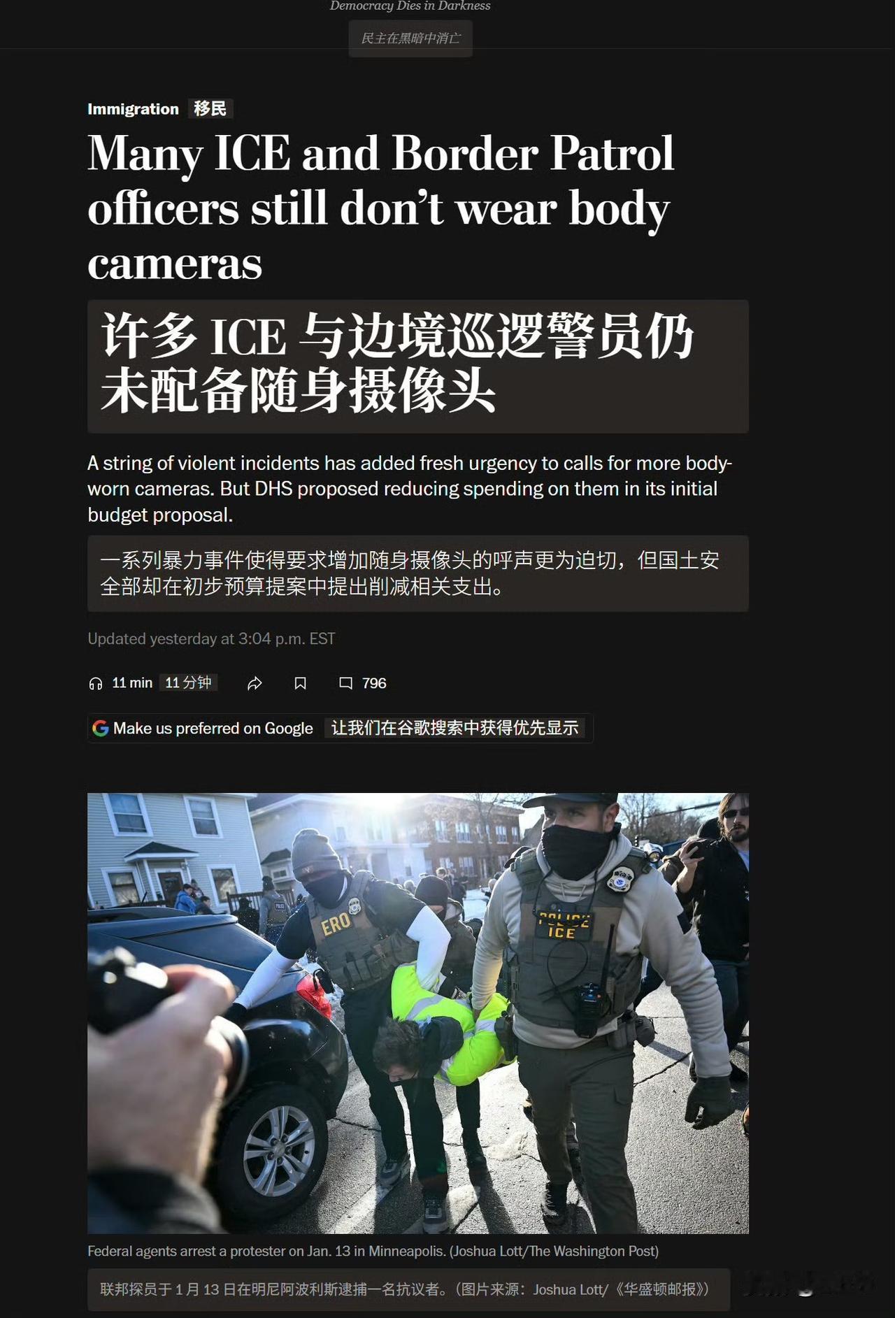 热知识:由于特朗普砍掉了拜登时代的法规,ICE 并不需要携带执法记录仪。而且特朗普政府还把移民海关执法局执法记录仪的项目经费砍了一大坨。由于 FBI 探员继续使用执法记录仪——这种做法在他们与国土安全部探员联合执法时引发了摩擦。据现任和前任执法人员透露,一些国土安全部探员反对 FBI 探员在联合行动中佩戴执法记录仪。这些官员称,在一些情况下,FBI 探员因此被排除在特定行动之外。ICE 的确会拿手机拍美国老百姓的脸,但是,不是为了执法,而是为了打击报复。比如:“你现在是国内恐怖分子了,我们有个漂亮的小数据库,我要把你上传上去。”