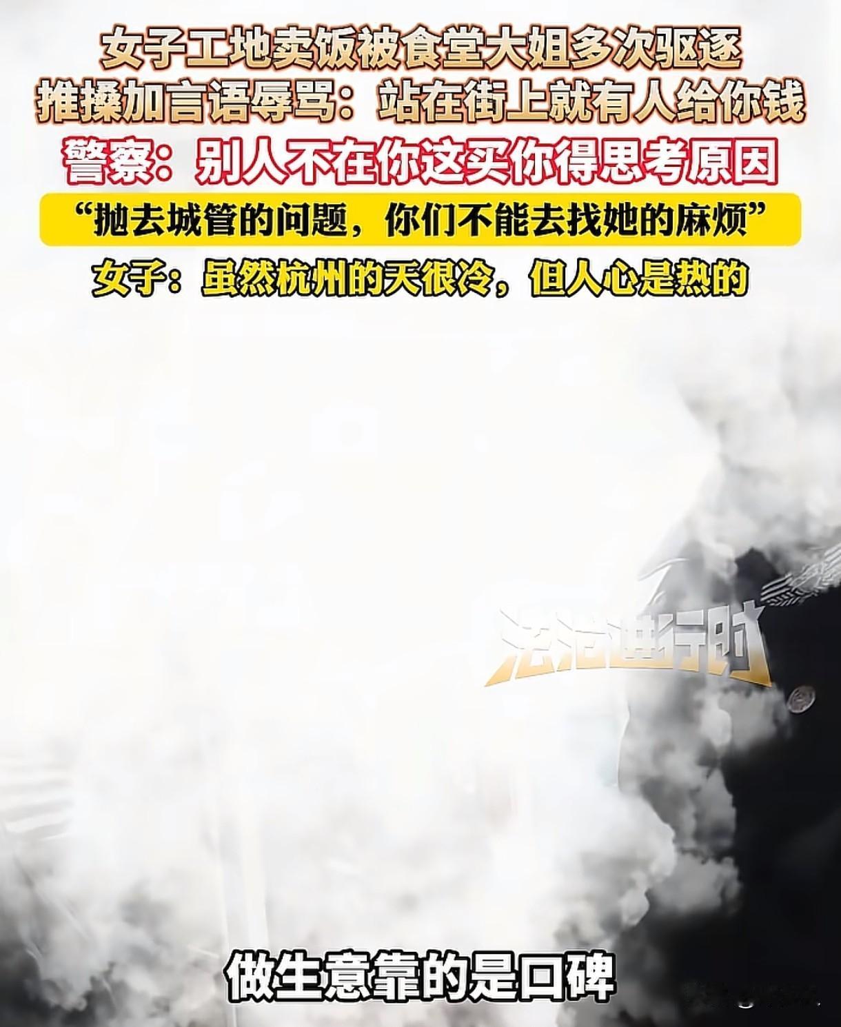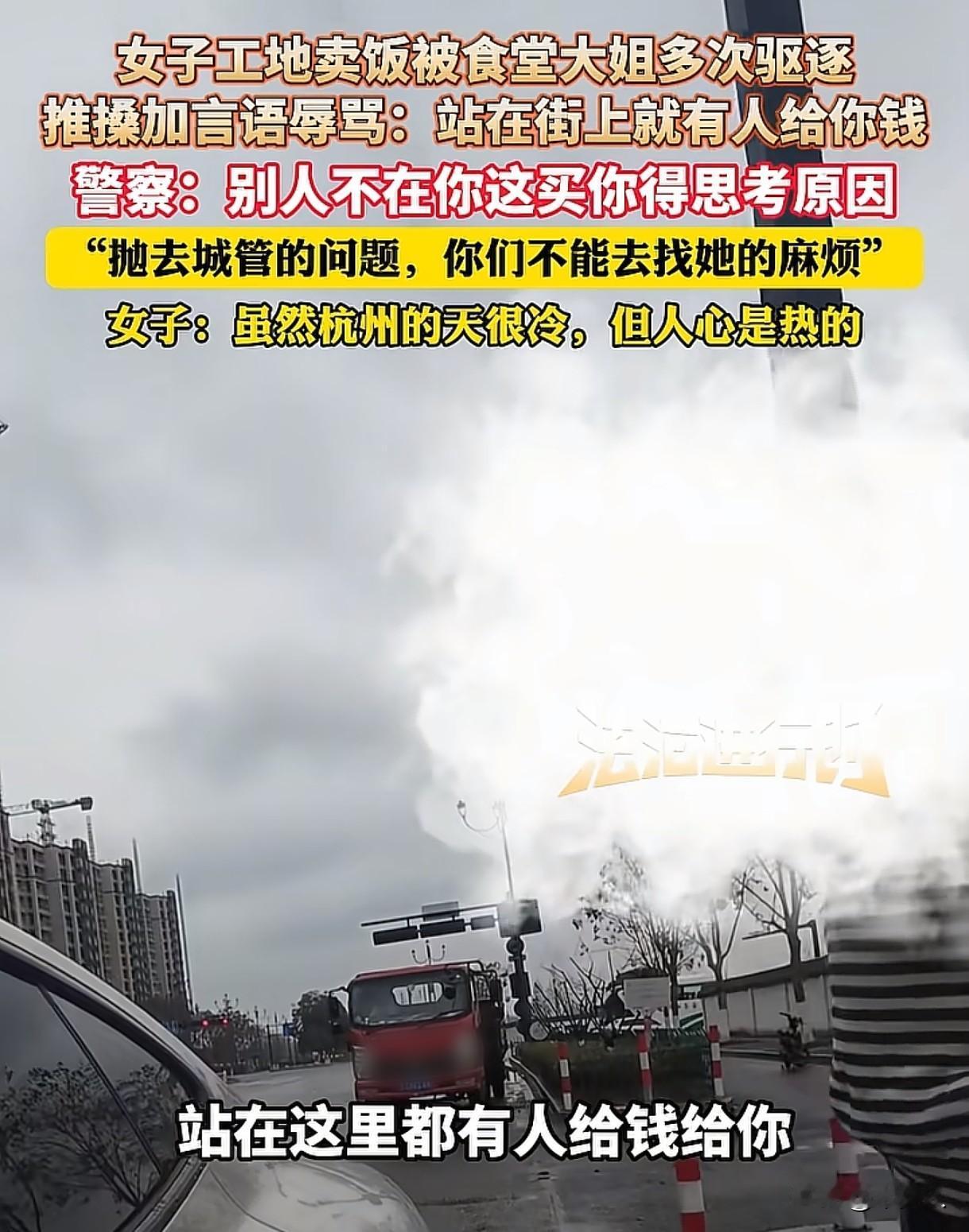 浙江杭州,女子在工地附近摆摊卖10元一份的卤肉饭,肉多菜足,让工地的人中午能吃饱吃好,可被食堂大姐发现后,大姐多次驱赶女子,不让她在那附近卖饭,推搡加言语辱骂:“站在街上就有人给你钱!”女子报了警,结局让人不可思议。 女子出摊那天,下着鹅毛大雪,天气冷得要命,可她还是像往常一样,坚持去工地附近的马路边摆摊。 工地干活的人下的是苦力,能吃上一份热乎饭,对他们来说心里也暖暖的,女子做的卤肉饭,10元一份,量大,物美价廉,还附赠了紫菜蛋花汤。 等女子给大家打完饭,准备收拾东西走人时,一个大姐突然冲了出来,质问女子:“谁喊你到这里卖的?” 工人们认识对方,这个大姐是承包工地食堂的人,他们赶紧帮女子解释:“今天就卖一下,明天她就不来了。” 可大妈根本不听,破口大骂:“管你*事!你到外面饭店去吃,没跟你讲吗?你愿意到哪里吃就到哪里吃?我没跟你们讲。” 女子心里挺委屈的,她觉得既然大妈觉得自己不应该在这里卖,那就走正常的程序,别天天来赶她。 可大妈却不依不饶,认为女子把饭卖给了工地上的人,就是不行。 看着咄咄逼人的大姐,一个工人看不下去,上前帮女子说话,不料大姐勃然大怒,甚至推搡起对方来。 女子也有些不开心:“你那天让我到前面去卖,我现在到巷子里卖了,你还来赶我。只要我在这里,你都是有话讲的。” 女子一边跟大姐沟通,一边收拾锅碗瓢盆,只想赶紧离开这里,不料大姐突然上前,推搡起女子来,好在旁边的人说拍了视频,打人了,大姐才停了下来。 见女子收拾东西,往车上搬,大妈骂骂咧咧追了过去,可她边走边骂:“站在这里就有人给你钱,你爱卖不卖!我女儿他们在公司上班的,比你强!” 言下之意,女孩是做特殊职业的,女孩也怒了:“你说话这么难听干什么?我卖饭怎么了?我凭自己的劳动卖饭怎么了?别人卖个饭,你这么贬低别人做什么呢?” 之后女孩报了警,民警调解时,跟店家沟通:“做生意靠的是口碑,靠的是口味,靠的是物美价廉。人家为什么要找她买,不找你买?你好好考虑考虑自己的原因!” 可大姐夫妻坚持认为女子把饭卖给工地的人就不行,这里是他们承包的。 女孩解释自己没在工地里面卖,也没有在大姐夫妻承包的地方卖,自己都已经走去很远的地方摆摊了。 大姐丈夫还威胁女子,说在法治之外,要跟女孩干到底。 民警耐心跟他们解释:“工地附近不准有摊贩,那不成了霸权了吗?人家村霸、路霸,你是什么霸,抛开城管这个事情,她摆在这个路上,没有说有违法违规的操作。她只要不越界,你们不能去找她麻烦。” 这事儿在网上也引起了热议。 有网友说:做生意得靠实力说话,你饭菜做得好,价格又实惠,工人自然会找你买,肯定是做得不好吃,大家才去外面买的。 女子也没有在工地里面摆,而是在马路边摆摊,食堂大姐觉得这个地方是自己承包的,那就去找工地,让工地解决。 如果大姐觉得女子不应该在工地附近的马路边摆,可以举报给城管或者相关部门,而不能自己动手赶人、推搡辱骂对方,这样既解决不了问题,还容易引发冲突。 这事说白了就是市场竞争的问题,大妈觉得女子抢了自己的生意,那就多想想怎么提升自己的饭菜口味和服务水平,而不是一味的刁难和赶走竞争对手,做生意得靠实力说话。