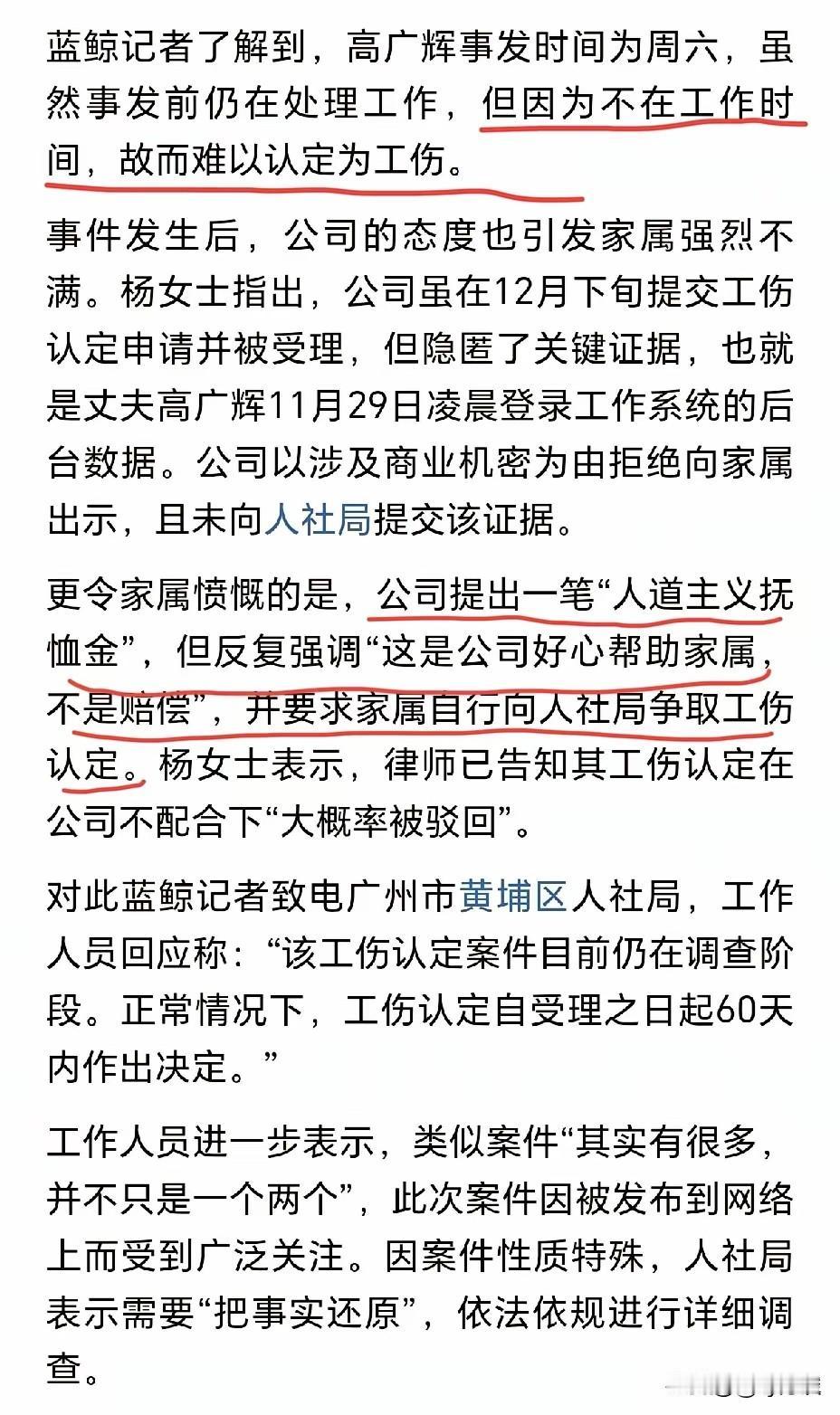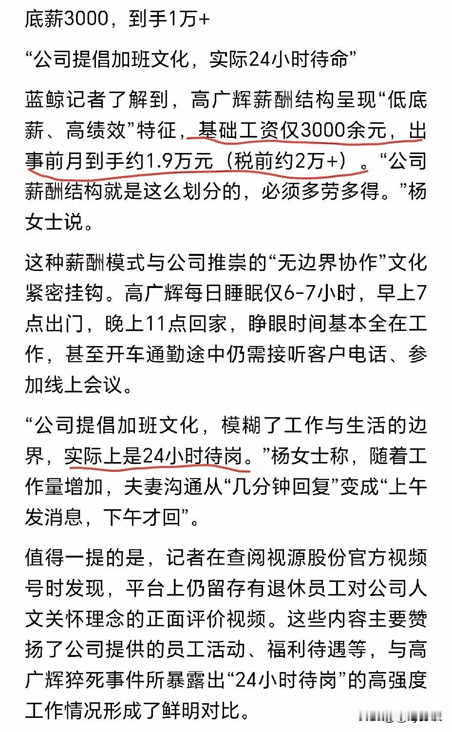 看到高广辉的遭遇,真的是让人触目惊心,特别是关于高广辉猝死的经过,真的是让人心惊胆战:每天二十四小时,但是睡眠时间只有六七个小时,早上 7 点钟出门,晚上 11 点钟回家。基础薪资只有三千元左右,但是每月的收入却有两万元左右,绝大部分是靠加班得来的,单位提倡加班文化。也就是说,他之所以能有如此的高工资,完全就是通过加班得来的。就是在猝死之前还在被单位分派任务,更让人寒心的是,居然单位不配合认定工伤,因为发生在周末。倒下一个高广辉,还有千千万万的后来者但是这个家庭就彻底倒下来了!