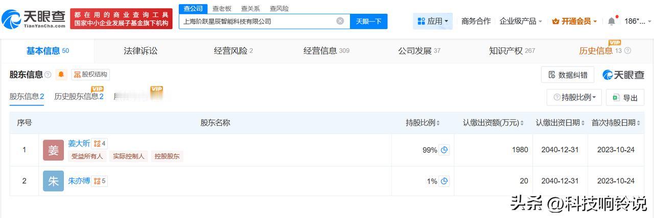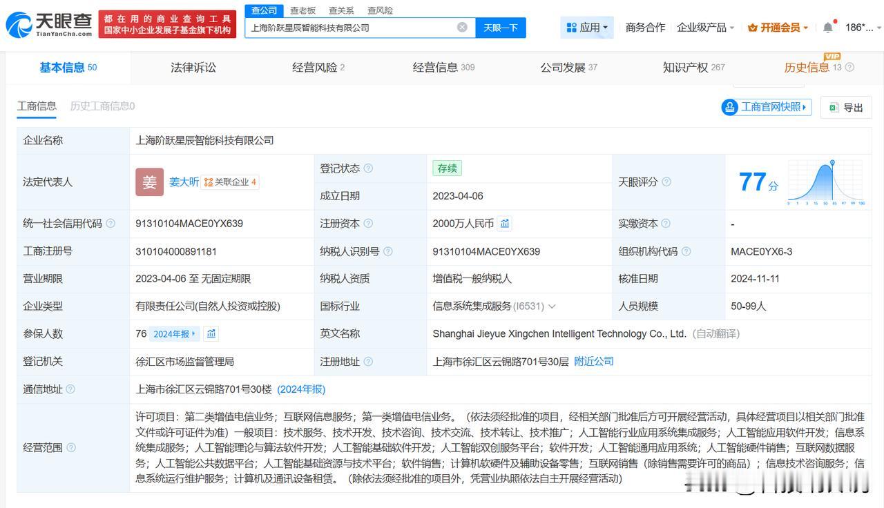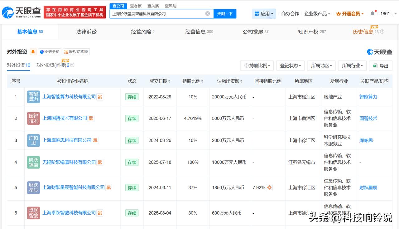 【揭秘阶跃星辰关联公司 阶跃星辰近一年成立多家新公司 阶跃星辰商业版图盘点 阶跃星辰对外投资10家企业】 据媒体报道,1月26日,阶跃星辰官方正式宣布完成超50亿元B+轮融资,刷新过去12个月中国大模型赛道单笔最高融资纪录。 天眼查App显示,阶跃星辰关联公司上海阶跃星辰智能科技有限公司成立于2023年4月,法定代表人为姜大昕,注册资本2000万人民币,经营范围包括人工智能行业应用系统集成服务、人工智能应用软件开发、信息系统集成服务等,由姜大昕、朱亦博共同持股。对外投资信息显示,该公司对外投资10家企业,均为存续状态。值得一提的是,2025年以来,该公司已成立无锡阶跃锡瀛科技有限公司、上海国智技术有限公司等多家新公司。 天眼查信息: