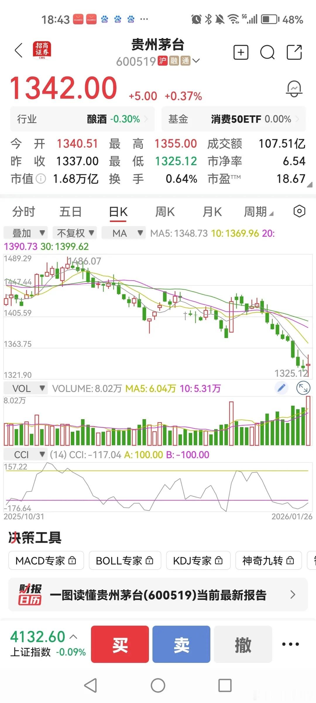 有股友称,贵州茅台是好企业,产品供不应求,只是估值太高了,虽然连着下跌,但也没到合理位置。茅台目前市净率6.54,市盈率18.67倍,1342的价格,普通人很难买得上。这么高的估值说明有着很强的市场流动性,也说明它的产品有着强大的市场消耗力,称上“供不应求“也是有道理的。虽然股价下跌了不少,但6倍的市净率说明还有待下跌。反过来说,这只股票下跌的还不够,说明市场对它的青睐程度没有很大的减缓,主要来自它的盈利能力。30%多的年净资产收益率仍吸引不少人前往,虽然小众买的不多,但大机构一持有就是一大笔,所以它的股价抗涨抗跌,抗打力强。18多倍的市盈率,说明价位过滤的还不够,短期仍会有波动。虽然30%多的盈利可能做撑股价,但因为小众买不起的原因,即便大机构买了,难免不存在量化交易行为,所以这只股票仍会有短期波动。