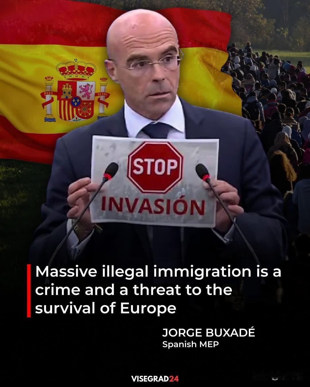 西班牙欧洲议会议员豪尔赫·布克萨德在欧洲议会举起这块牌子说: “大规模非法移民是一种犯罪行为,也是对欧洲生存的威胁。” 随后,他提出了 10 项打击非法移民的措施,其中包括阻止非法移民获得任何类型的居留许可或社会保险,以及阻止非政府组织从沿海地区收集移民并将他们带到欧洲。 欧洲边境管理局(Frontex)表示,2025年欧盟非法越境事件的查获数量约为 17.8万起。