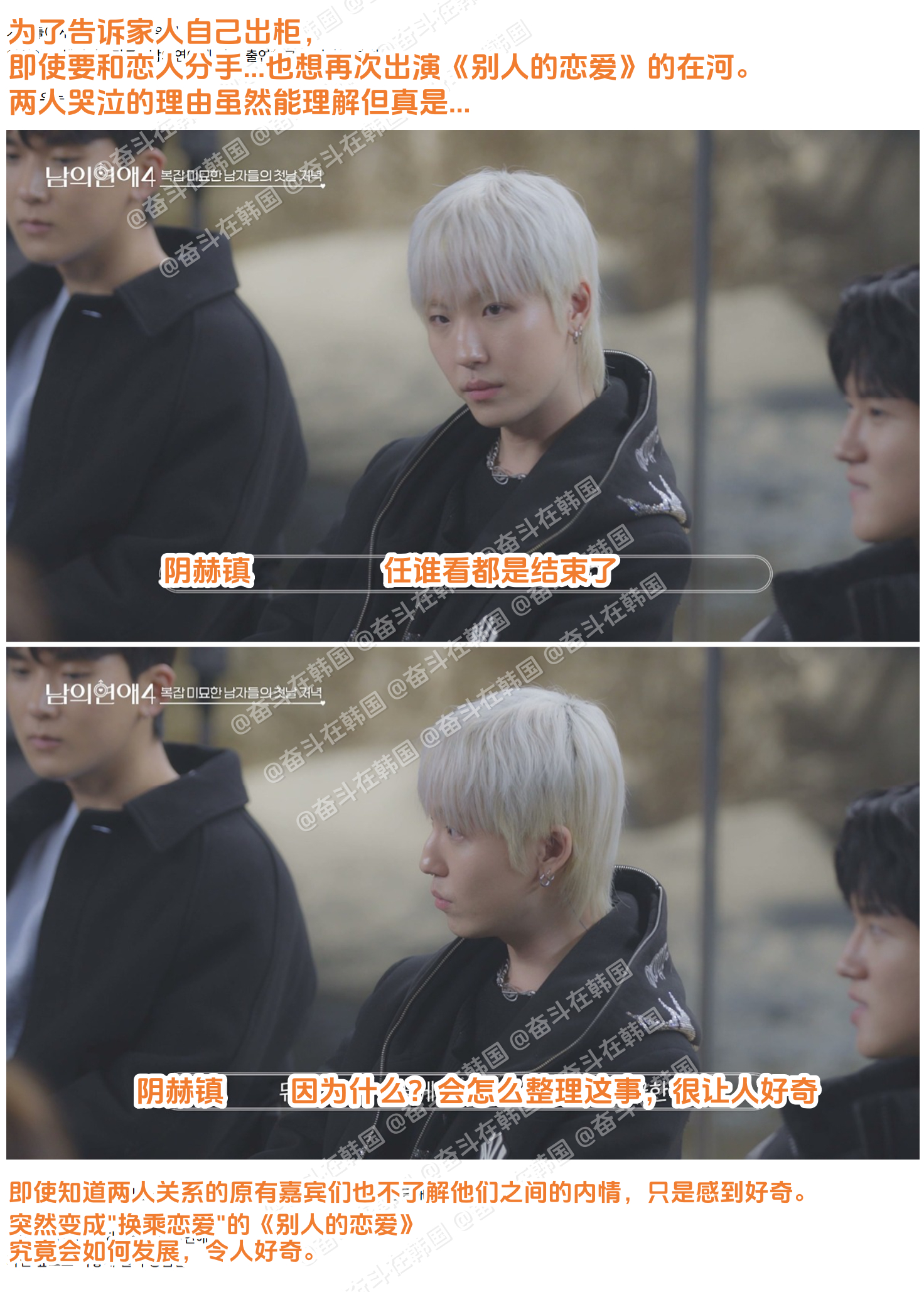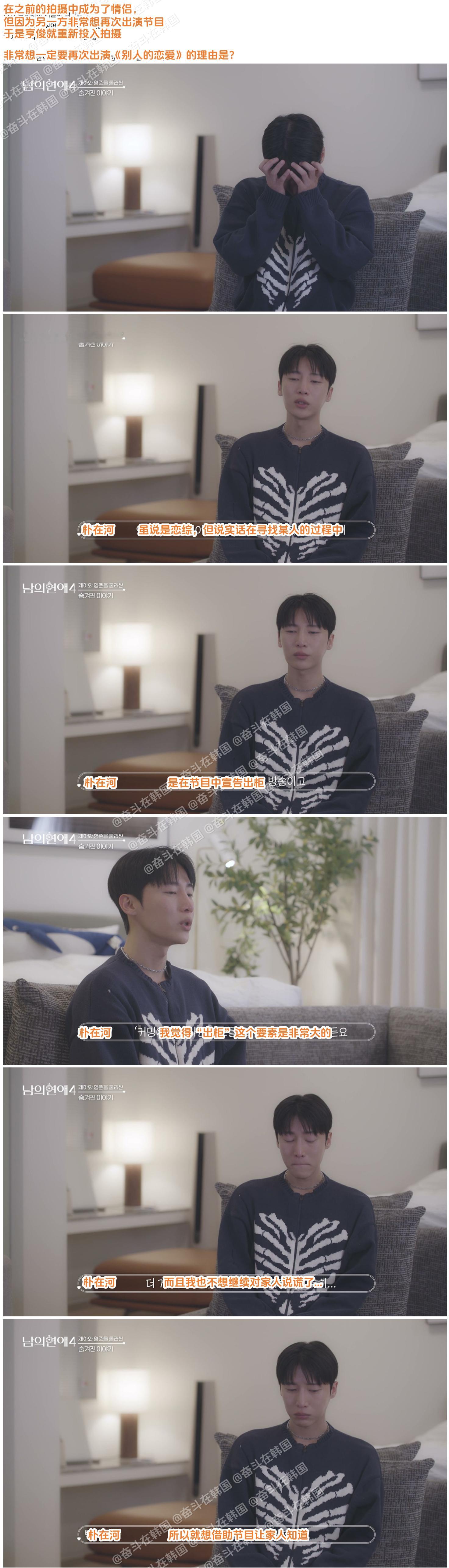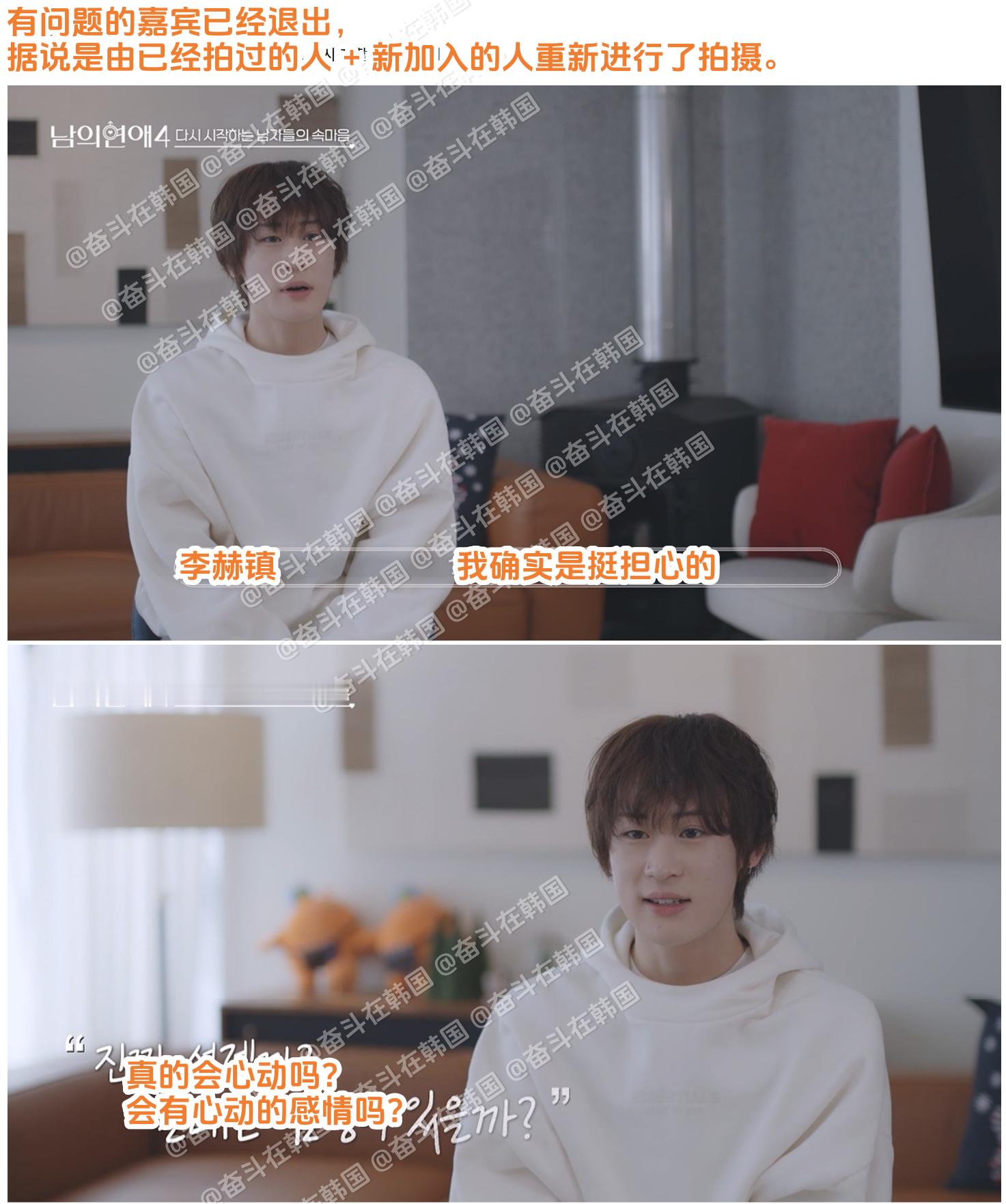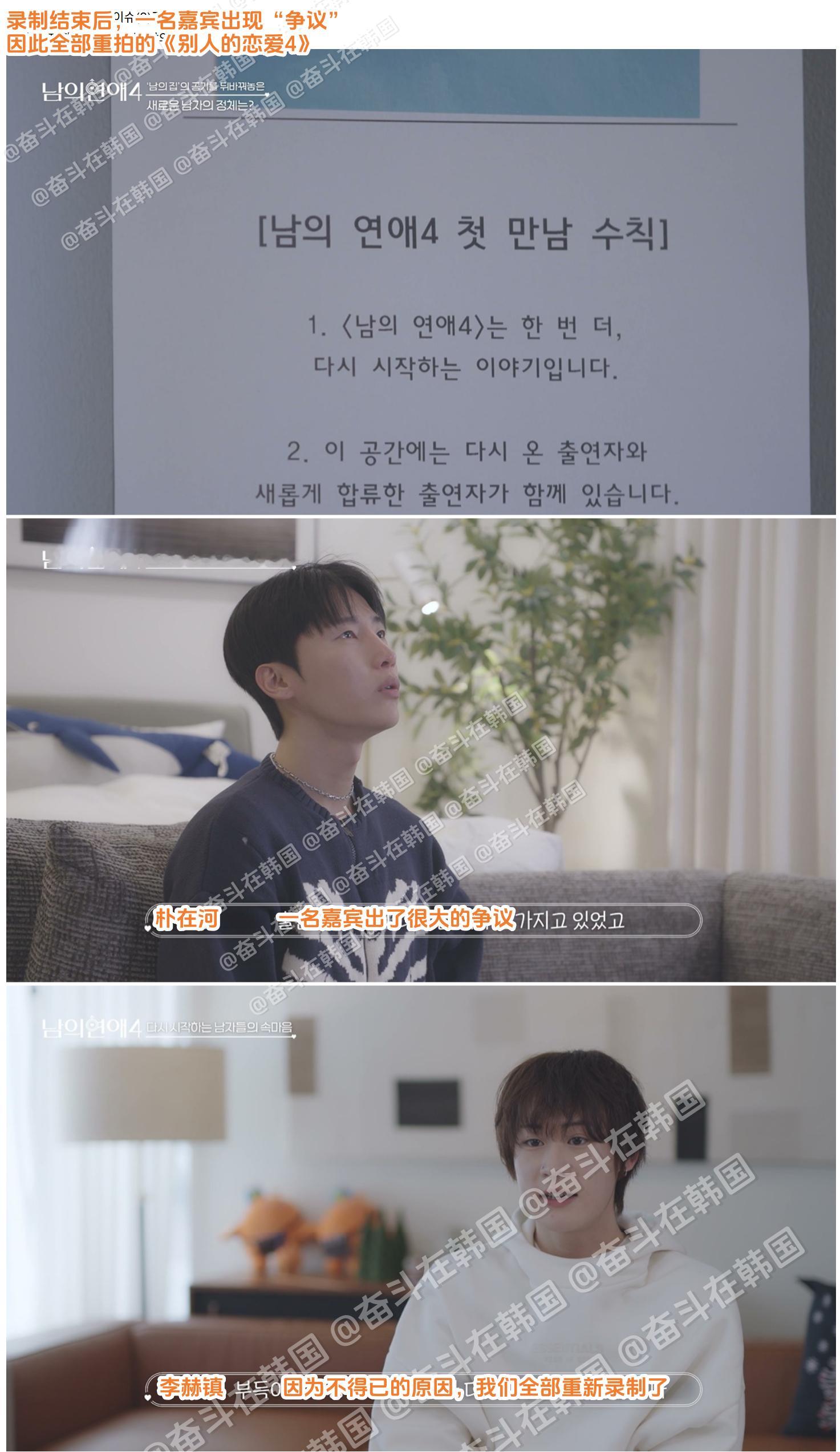 韩国男同恋综《别人的恋爱4》变成《换乘恋爱:别人的恋爱4》的原因:海外新鲜事热点现场 第1集时,看起来和之前几季的拍摄方式一样,但根据第2集透露的信息,由于原出演嘉宾中一人出现不得已的情况(据说是爆了很大的雷),导致原有的拍摄素材无法使用。因此,当前公开的拍摄内容是除了重新拍摄时新加入的2人(金韩洁、赵允宰)之外,由原嘉宾中的8人重新拍摄,并假装是初次见面。甚至,在原嘉宾中,朴在河和李亨俊在第一遍拍摄中最终成为了情侣。虽然李亨俊并不想再次出演,但由于朴在河强烈的节目出演意愿,最终两人分手并都重新出演了节目。实际上,这相当于变成了《换乘恋爱:别人的恋爱4》。