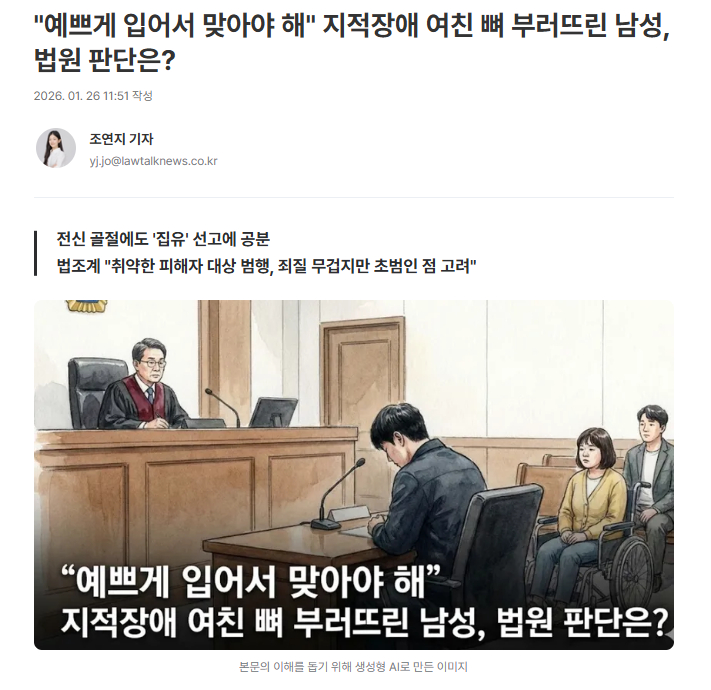 【韩国男子将智障女友殴打致全身骨折,法院竟判处缓刑】海外新鲜事热点现场 韩国庆尚南道金海市一名20多岁的男性经常性暴力殴打患有重度智力障碍的女友,导致其全身骨折等重伤,法院对其宣告缓刑。据悉,受害者是防御能力明显低下的残疾人,施暴者却以“穿得漂亮”这种荒唐理由施加暴力,因此关于法定刑罚的适当性引发争议。昌原地方法院刑事7单独法庭(法官李孝济)26日宣布,对因伤害、暴力、威胁等嫌疑被起诉的A某(20多岁)判处有期徒刑1年6个月,缓刑3年。事件起因要追溯到去年2月。A某在庆尚南道金海市住处等地,开始随时肆意殴打女友B某。特别是以B某平时穿得漂亮为由,对其全身进行严重殴打,造成多发骨折及挫伤等需要治疗42天的重伤。不仅如此。A某还以B某将其与过去男友进行比较等为由,共实施6次暴力行为,甚至用厨房的金属筷子进行捅刺般威胁,营造恐怖氛围。受害者B某患有重度智力障碍,难以对此类残酷行为做出适当应对或向周围求助。需治疗42天的“严重伤害”,法律争议点是什么?本次事件最核心的法律争议点在于受害者是“对犯罪行为易受侵害的重度智障人士”,且伤害程度达“需治疗42天”之重。对A某适用的嫌疑主要有三项。首先,造成全身骨折的行为符合刑法第257条第1项(伤害罪)。此外,6次反复暴力行为分别适用刑法第260条第1项(暴行罪),使用金属筷子威胁则适用刑法第283条第1项(威胁罪)。特别是鉴于受害者为重度智障人士,是否违反《残疾人福利法》也受到关注。《残疾人福利法》第59条之9严格禁止对残疾人的暴行及伤害行为,规定违反时可处以比刑法更重的罚金刑等。“罪责虽重但反省中”,宣告缓刑的背后考量审判部明确指出,本案罪行性质非常恶劣。据判决书称:“反复暴力殴打智障受害者,伤害相当严重,因此罪责重大。”实际上,根据大法院量刑标准,对“易受犯罪行为侵害的受害者”实施伤害是加重处罚因素。本案属于建议刑期为6个月至2年有期徒刑的“加重领域”,实际宣告的1年6个月有期徒刑接近该范围的上限。尽管如此,法院选择缓刑而非实刑的原因在于A某的前科和态度。审判部解释说:“考虑到A某承认错误并进行反省,以及除过去受过少年保护处分外无其他犯罪前科,属于初犯。”法律界相关人士分析称:“被告针对重度残疾人的犯罪,判处实刑的可能性很高,但考虑到被告人为20多岁年轻人且无刑事处罚前科的情况,刑事政策上也会做出给予其在社会中教化机会的判断。”从类似判例看针对残疾人犯罪的严厉性本次判决与过去类似判例轨迹一致,同时显示出根据受害者的残疾程度适用严格标准。过去清州地方法院也曾对造成不特定受害者重伤的被告人判处有期徒刑1年6个月实刑,大田地方法院论山分院则在一起有智力障碍的被告人实施暴力及伤害的案件中,虽认定心神微弱,但仍判处了有期徒刑1年6个月。本案中,A某虽以缓刑获释,但在未来3年缓刑期间若再次犯罪,将合并执行此次宣告的1年6个月有期徒刑。部分残疾人权团体呼吁,针对弱势群体的“无差别暴力”需要更坚决的法律执行。