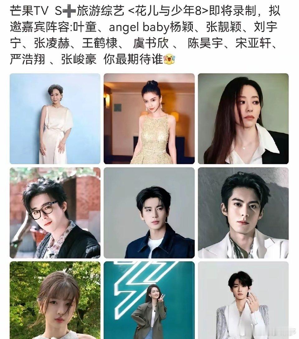 网传Angelababy将加盟花少8,目前在传名单有叶童(66岁)、戚薇、侯佩岑等,还有刘宇宁、张子枫、虞书欣等……这名单简直让人眼前一黑又一黑!别说花少系列素有“单数季封神,双数季翻车”争议(如第二季剪辑激化矛盾,第六季评分仅5.8)。这第八季是否会重蹈覆辙成为“翻车”季,很多观众和粉丝都持怀疑态度的。那面对这巨大争议的一季,估计很多人是不敢冒险的。而且第八季定位“青春游学探访节目”计划打造“热带到极地”史诗路线:越南富国岛→马来西亚→新西兰→南极,温差跨70℃。若成行,将是国产综艺首次深入南极拍摄,涵盖冰潜、极地露营等高危项目。节目组已备3吨防冻设备。所以,面对如此严酷的考验,没点体力和胆色肯定是走不下去的。Baby本来才刚刚事业有点起色,总不至于再踏进火坑吧。而叶童属高龄嘉宾,能否适应南极高危项目,实在是充满了不确定性。而戚薇作为湖南台的常驻综艺嘉宾,观众都审美疲劳了。而刘宇宁有《地球超新鲜》还要录,张子枫则有《向往的生活》,估计不会再掺混其它节目了。至于虞书欣这种尚有风险的艺人,芒果台应该很谨慎,不会拿节目当儿戏的。小妹就更不用说了,都出自芒果台自己的艺人,而且这两年小妹都火了,比如张雅琪,所以竞争者、想上的估计都挤破头了呢。大家觉得呢?更看好谁上节目呢?