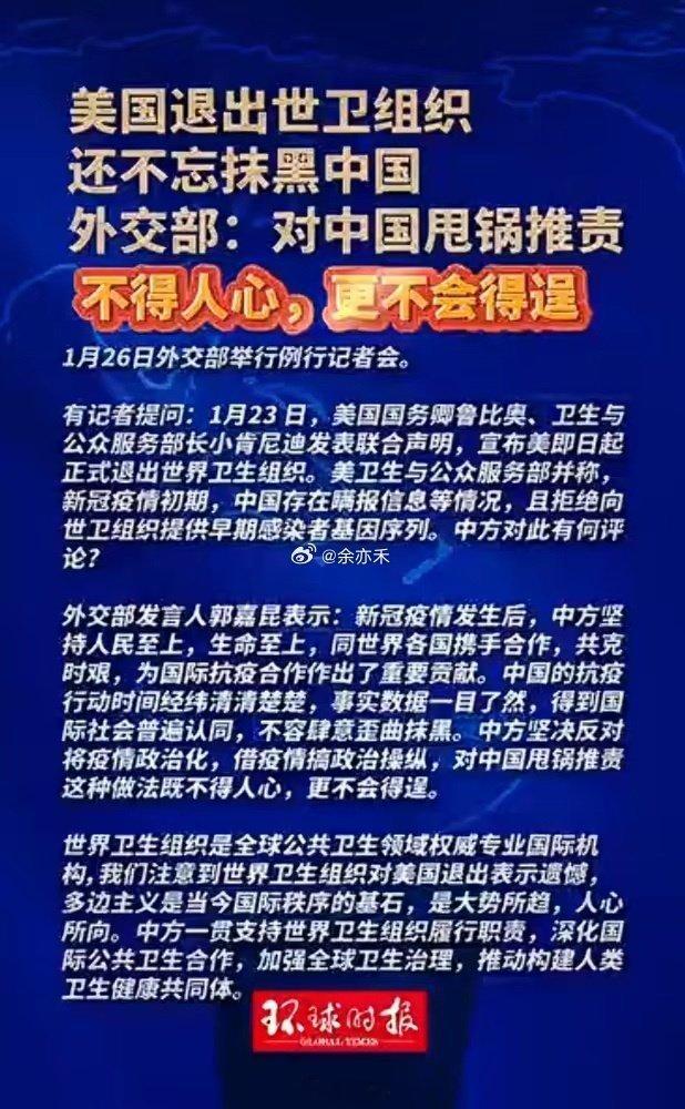 中方坚决反对将疫情甩锅中国某些国家抗疫摆烂,来武汉参加军运会的事情妇孺皆知,反倒有脸甩锅中国?这操作真是让人笑掉大牙!自己国内死那么多人不反思,反倒怪别人?中国疫情刚爆发就第一时间分享病毒序列,还给全世界送疫苗、送经验,这份担当谁看了不说句服?拿科学问题搞政治操弄,不仅恶心,更暴露了自己无能。病毒是全人类的敌人,不是用来甩锅的工具。这种把戏,国际社会早就看透了,别在这儿自取其辱了! 专栏 · 中美博弈|俄美博弈|中俄联手|寰球动态