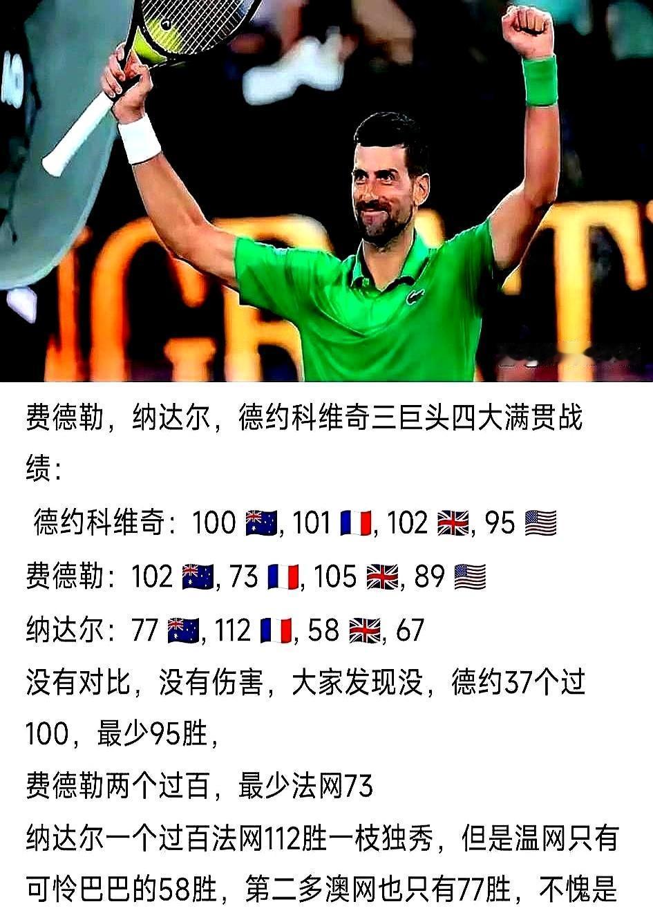 400胜,这数字听着像游戏外挂,可德约真把它刷成历史独一份。 墨尔本102胜+10冠,直接把澳网打成自家后院。 温网102胜,离费德勒105只差三场,草场老头纪录眼看不保。 法网100胜,听着牛,可纳达尔112胜14冠横在前面,像一座喷火的土山,翻不翻得过去另说。 至于总24个大满贯,他早把费纳甩后视镜,可他自己还嫌“不齐活”,非得四项胜场全第一才肯摁关机键。 38岁了,别人养老他开挂,卷完对手卷历史,卷完历史卷自己。