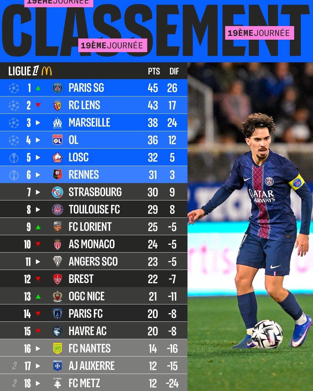 【法甲积分榜】 法甲 2025-26赛季法甲联赛第19轮积分榜。