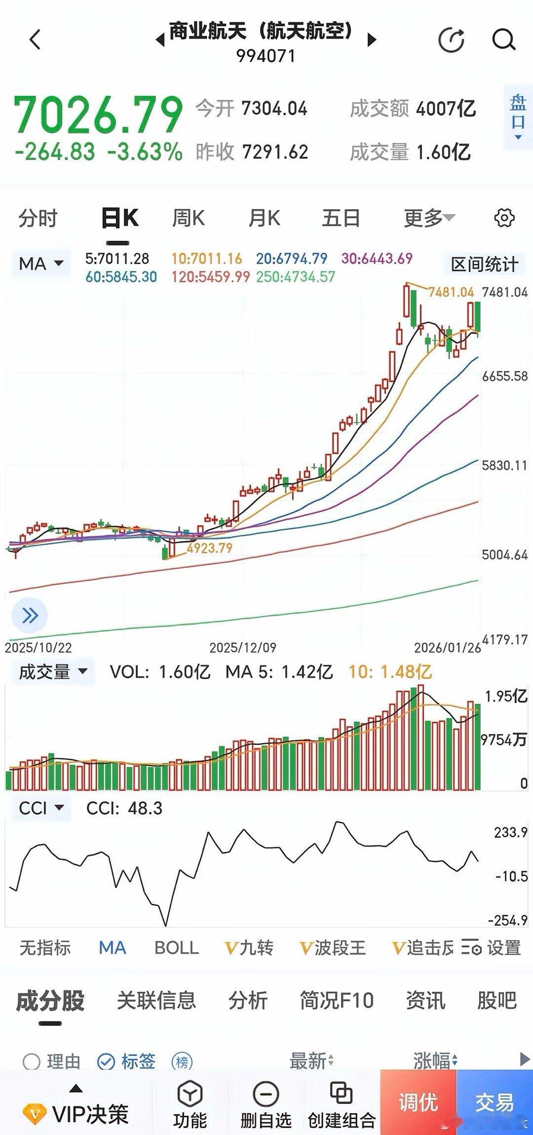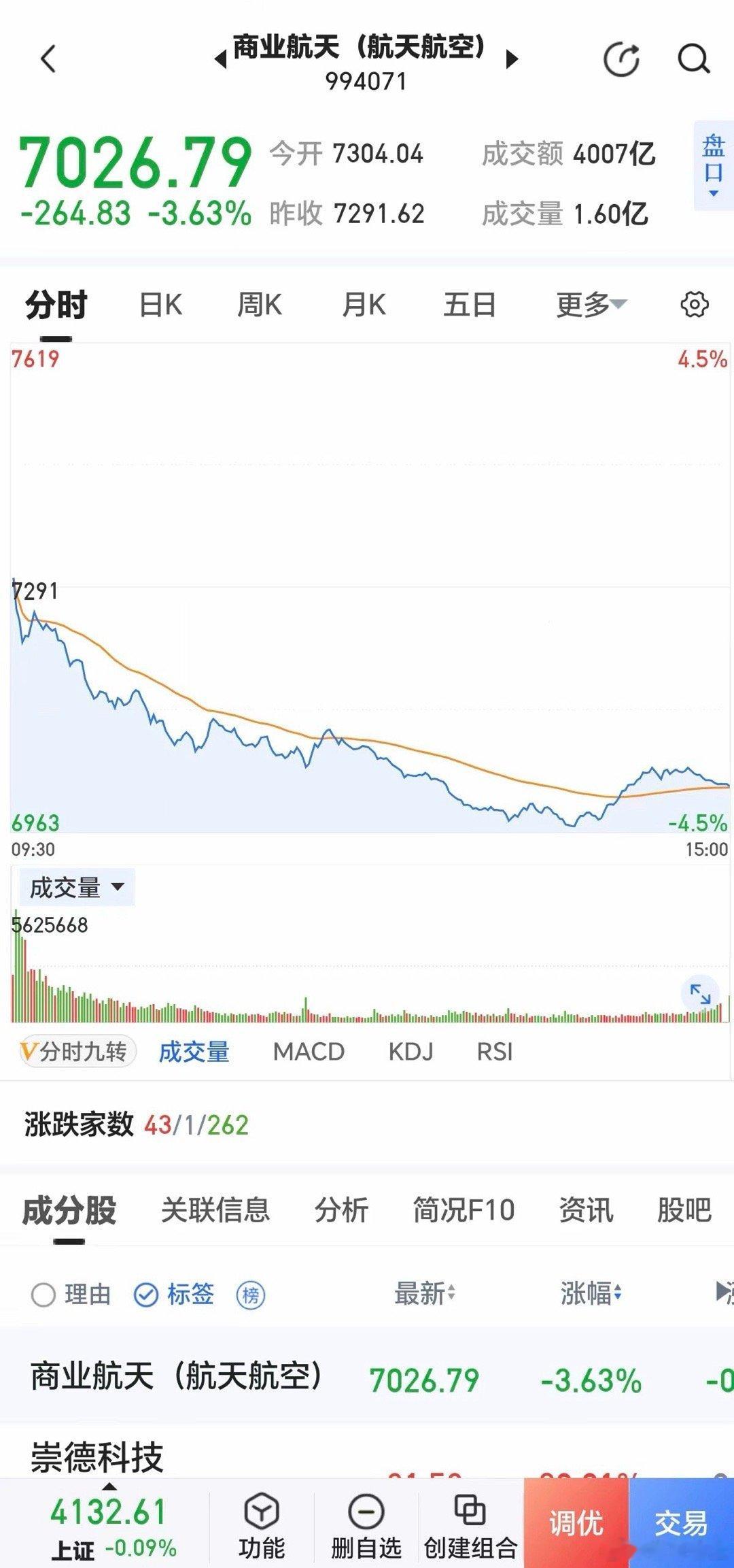 商业航天击鼓传花游戏结束,今日狂泻,龙头:航天动力、中国卫通、中国卫星、航天电子等午后跌停,板块下跌3.63%,K线形成双顶,下跌才刚刚开始,那些鼓吹是今年主线者留点口福,不要再忽悠人了。上周五的虽然上涨3.61%,但量能已经萎缩,上涨属于回光返照,不少人已经被被套在山顶。