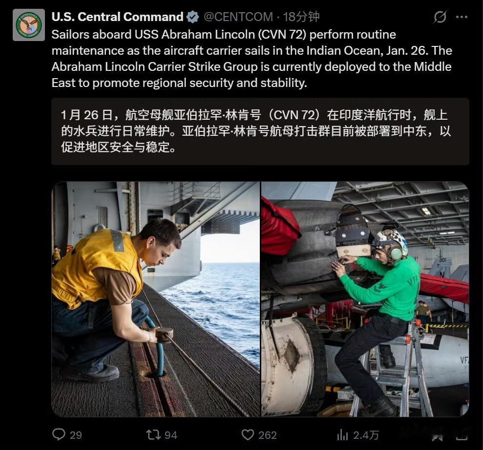 1 月 26 日,美国海军亚伯拉罕·林肯号航母(CVN-72)已抵达阿曼海岸附近