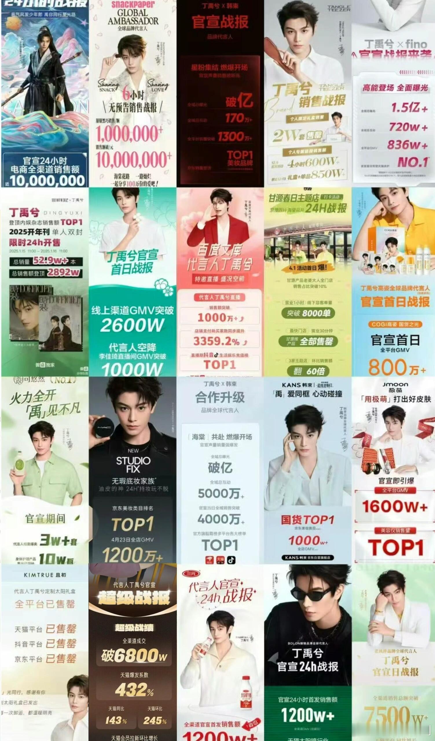 丁禹兮二爆后的一年商务战报有20个,几乎每个商务销售额都破了千万,涵盖了衣食住行各方面
