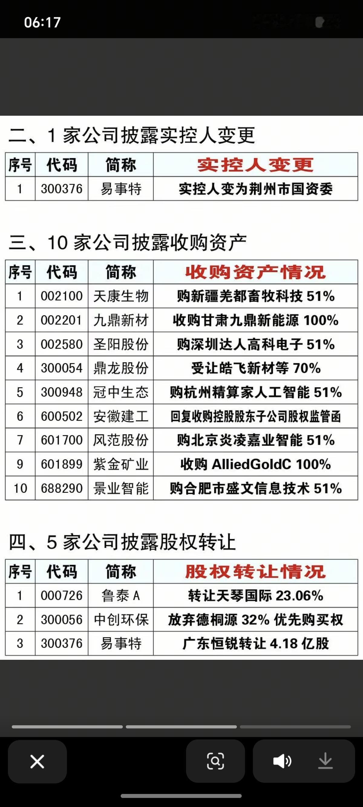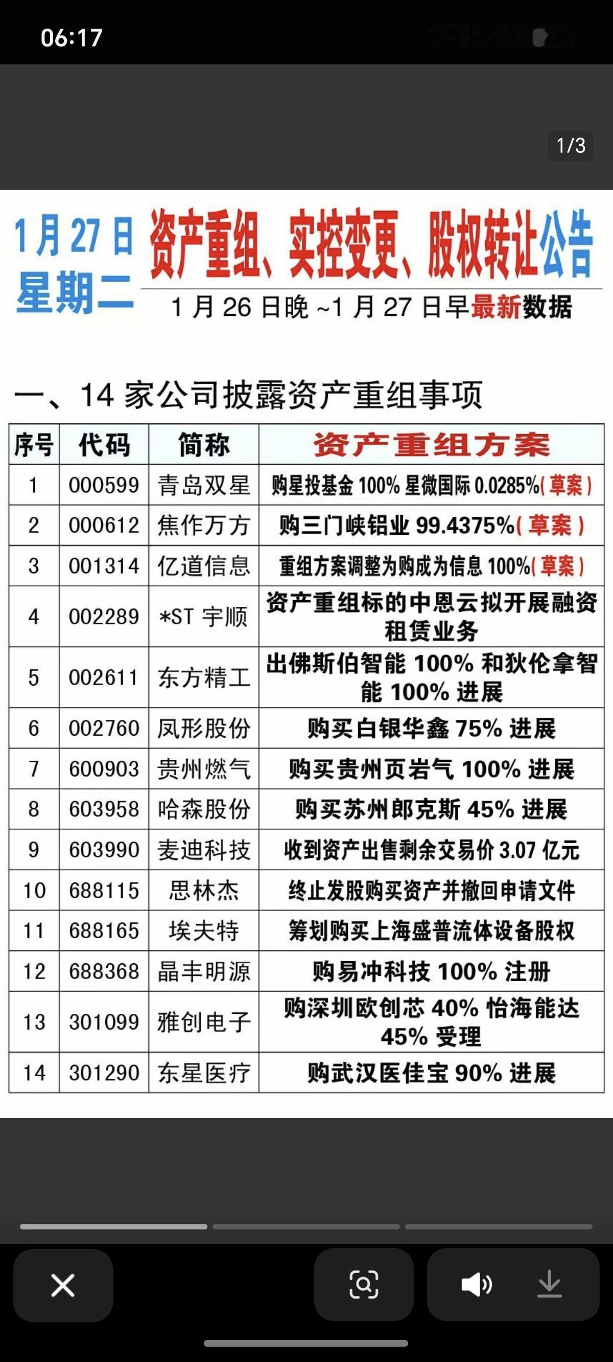 1.27周二 最新:资产重组、股权转让,实控人变更公告! 14家公司披露资产重组 10家披露收购资产 5家股权转让 1家实控人变更 4家披露出售资产