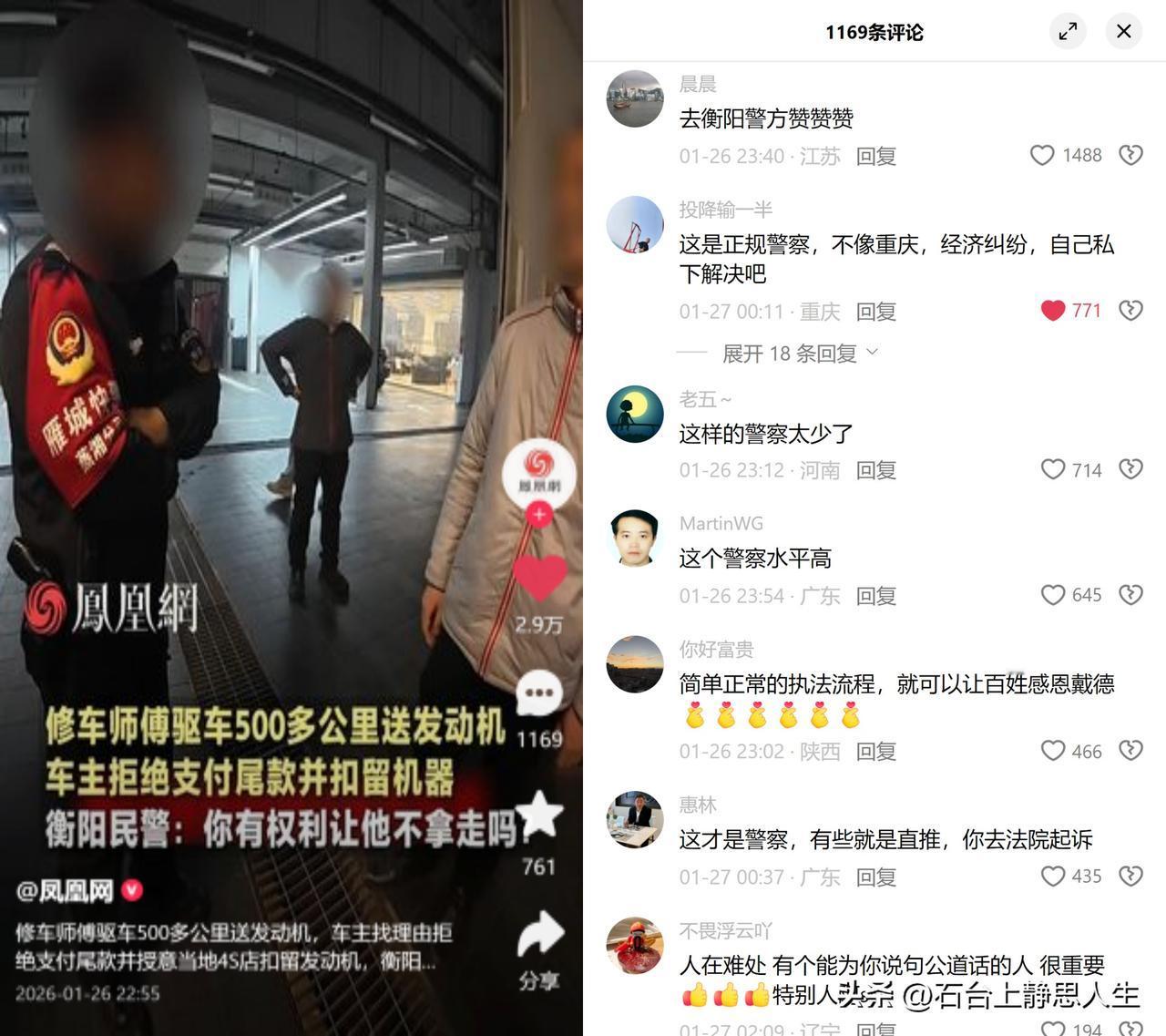 500公里送发动机遭扣,帽子叔叔一句话点破了歪理! 武汉汪师傅驱车500公里赴衡阳送发动机,车主不仅拒付尾款,还授意当地4S店扣下货物,急得他当场找帽子叔叔。 让人暖心的是,赶来的帽子叔叔李理没和稀泥,反复追问一句:“你有权利让他不拿走吗?” 这句话太顶了。汪师傅从长途奔波的疲惫,到被刁难的无奈,听到这句时估计瞬间踏实了,终于有人跟他讲规则,不再是扯人情。 这本是帽子叔叔履行正常职责,却引来大家点赞。为啥?因为太多时候,普通人遇到纠纷要么被建议私下解决,要么被踢来踢去。 我们没想要特殊照顾,只希望在有理的时候,有人站出来把规则两个字说清楚。 多些这样认死理的官方人员,咱们在外打拼才真的有底气。