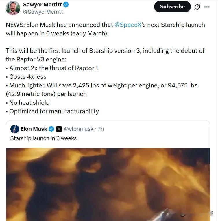 新闻: Elon Musk 宣布 @SpaceX 的下一次 Starship(星舰)发射将在6周后(3月初)进行。 这将是 Starship 第三版的首次发射,包括 Raptor V3 发动机的首次亮相: - 推力几乎是 Raptor 1 的2倍 - 成本降低4倍 - 重量大幅减轻。每台发动机将节省2,425磅重量,每次发射共节省94,575磅(42.9公吨) - 无隔热罩 - 针对可制造性进行优化