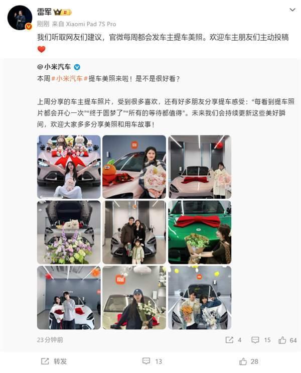 雷总说每周都要发车主提车美照,并表示这是网友的建议。 我感觉提建议的网友很可能是受到微信朋友圈某些卖家的启发。我经常在朋友圈看到卖家在晒单。