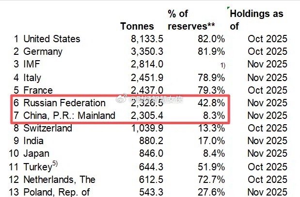 黄金价格冲破5100美元/盎司大关的同时,中国央行持有的储备黄金数量距离超越俄罗斯仅剩一步之遥。美国把“林肯”号航母开到了中东,越来越有准备向伊朗发动进攻的架势了。这一地缘动荡再次刺激黄金价格进一步上涨。1月26日,伦敦金一举突破5000美元和5100美元两大关口。高盛之前预测今年年底金价会到5500美元/盎司的水平,现在来看还是太保守了,也许一两个月后就能达到。金价上涨,谁最受益?自然是此前大举买入黄金的投资者,这里面既有个人、机构,又有各国央行,其中我国央行无疑是佼佼者。中国央行近年来两次持续增持黄金,第一次是在2022年11月至2024年4月,累计增持1016万盎司储备黄金,持仓量从6264万盎司飙升至7280万盎司。之后沉寂了半年,直到当年11月再次开始买入黄金。截至2025年12月,我国已连续14个月增持黄金,持仓量增加至7415万盎司,几乎可以肯定的是进入2026年后央行还会继续购买储备黄金,把持仓量给拉上去。纵观全球,拥有储备黄金数量最多的是美国。根据世界黄金协会披露的数据显示,美国持有8133.5吨的黄金,遥遥领先其他国家。包括德国、意大利、法国在内的欧洲三国排名第二至第四位,持有量在2437吨至3350.3吨之间。接下去是排名第五的俄罗斯,截至去年11月底持有2326.5吨储备黄金,中国经过两轮增持不仅扩大了与身后瑞士、印度、日本央行的差距,而且大大缩小了与俄罗斯央行储备量的距离。鉴于世界黄金协会的数据数据更新至2025年11月,未算上12月我们买入的黄金,算上后中国的储备黄金数量只比俄罗斯少20吨左右,大家都是2300多吨的水平。同时,之前传出消息说俄罗斯为了缓解外汇和财政收入吃紧的问题,准备卖掉一部分储备黄金。我们不断增持、俄罗斯准备减持,这意味着用不了多久中国将成为世界第五大储备黄金持有国,并且意大利和法国的差距不大,在200吨以内。当然,从黄金占外汇储备的比例来看,咱们持有的黄金数量依然较少。哪怕这两年金价疯狂上涨,咱们持有的2300多吨黄金对应的价值只占外汇储备的8.3%。作为对比,美国、德国、意大利、法国的该比例均在80%左右,俄罗斯是43%,印度都有17%,而日本和咱们差不多。究其原因除了中国是世界上外汇储备规模最大的国家外,很长一段时间里我们几乎不增持黄金。2022年开始情况终于有了变化,多元配置储备资产和“去美元化”要求提高黄金储备,我们开始加大“买金”,结果赶上了这轮史无前例的金价上涨狂潮,从投资收益的角度来看赚得盆满钵满。相信中国还会继续增持黄金,我觉得怎么也得逐步增持到德国的水平,也就是超过3300吨才差不多。