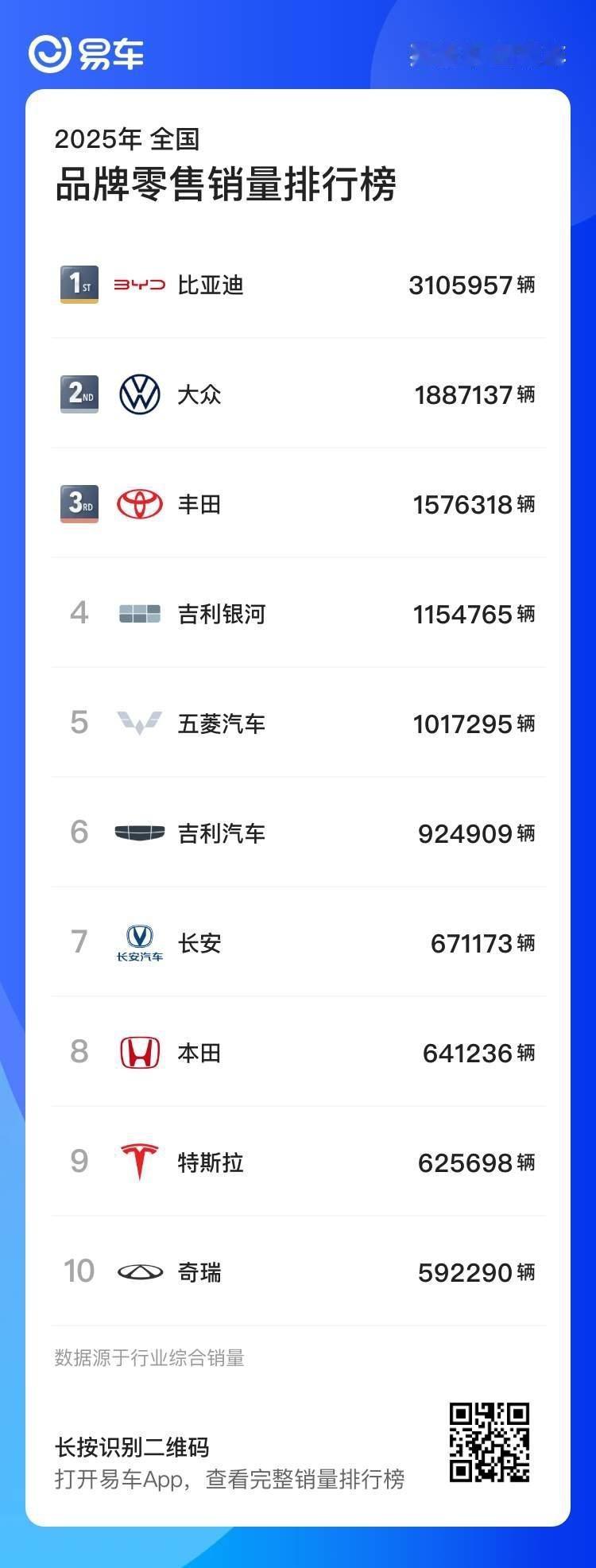 2025年汽车品牌销量排名