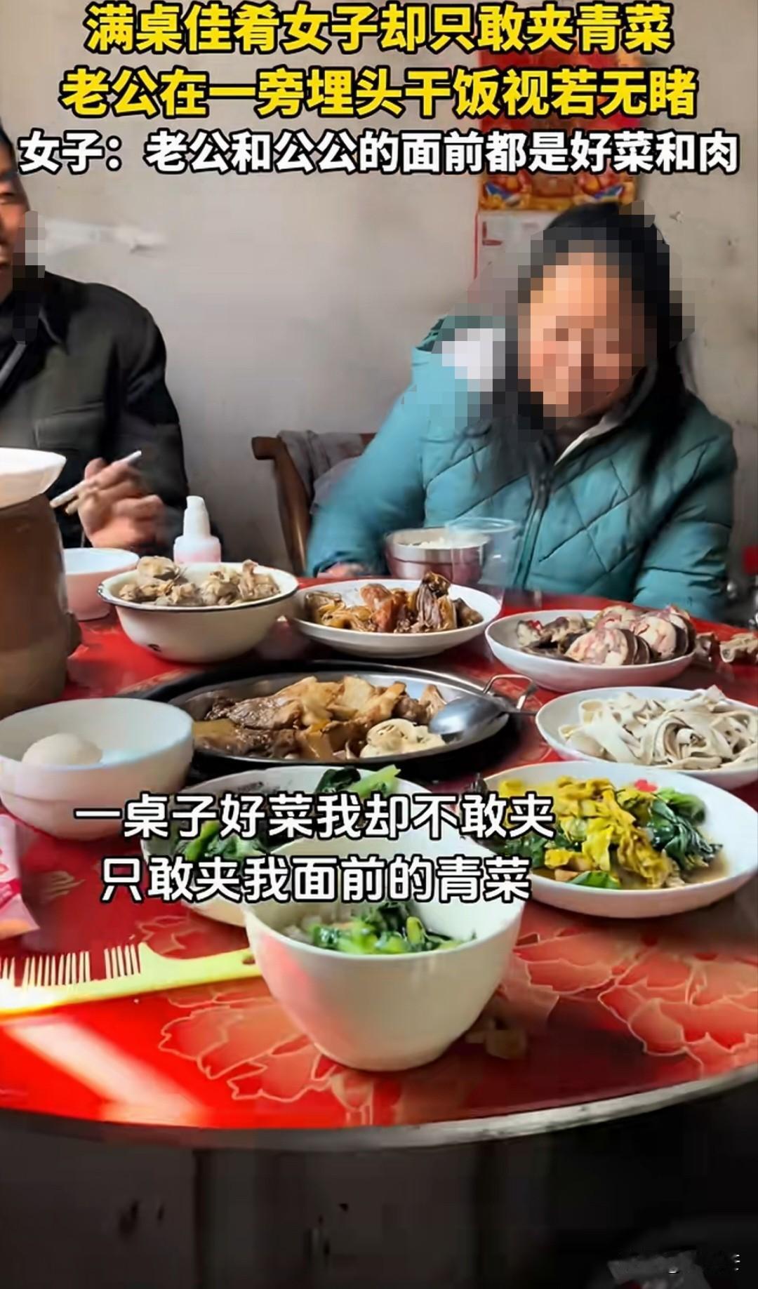 “这还不掀桌子吗?”一女子和老公孩子回老家,公婆准备了一桌子美味佳肴。结果鸡肉、排骨、香肠都放在老公和公公面前,自己和儿子前面放的是鸡蛋、菠菜和豆皮。丈夫狼吞虎咽的吃肉 ,她只敢夹面前的菠菜,想吃肉也不敢伸筷子,婆婆一脸开心的看着儿子吃肉,甚至都不看儿媳和孩子一眼。 视频中婆婆一直让儿子多吃,自己老公也吃的很欢实,一直在吃排骨、吃肉。婆婆看着儿子吃的非常开心,公婆和老公还一直聊天说话,他们一家三口其乐融融。 老公身边坐的是自己儿子,自己儿子也是吃的青菜。女子碗里是菠菜,面前放的也是菠菜,她抬抬筷子然后又无奈的放下,也不知如何是好。 有人说这是婆家潜意识里把你当成了外人,从座位也可以看出来,人家一家三口才是一家人。 婆婆、公公和老公坐在一起,然后他们那边摆的都是好菜 ,婆婆心疼儿子,把好吃的都留给儿子,丝毫想不到儿媳和孙子一点。 也有人说,公婆对自己的态度尚且可以接受,毕竟也不是人家亲生的。可是老公太没数,自己吃的那么痛快,吃肉吃的一点不含糊,儿子和老婆就在旁边,他都没想到,这太过分。 其实婆家人对媳妇的态度,很大一部分取决于老公的态度,要是老公很重视媳妇,婆婆绝不敢那么对儿媳!
