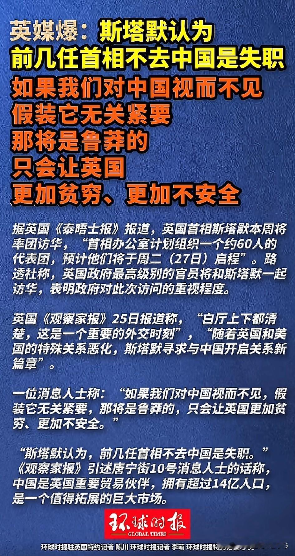 英国首相斯塔默:我们已经8年没去中国看看了,今年必须去。[捂脸] 英国首相斯塔默批评英国前几任首相没去中国访问是失职。他说当英国还在犹豫时法国去了8次,德国去了4次,我们错过了很多机会。 斯塔默还行,最起码勇于承认。不像那个新英国人苏纳克,英国经济没搞好英国人的固执和傲慢偏见倒是一个不落的学个通透。 不过,让英国人承认现实并低头的还是形势,因为英国发现想靠美欧已经靠不住了… 朋友们,你们对此事怎么看? 欢迎大家在评论区探讨,留言…[送心]
