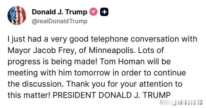 特朗普与明尼阿波利斯市长通话 特朗普:我刚刚与明尼阿波利斯市长Jacob Frey进行了一次非常愉快的电话交谈。我们取得了很大进展!Tom Homan明天将与他会面,继续讨论此事。感谢你们对此事的关注。 ——总统唐纳德·特朗普