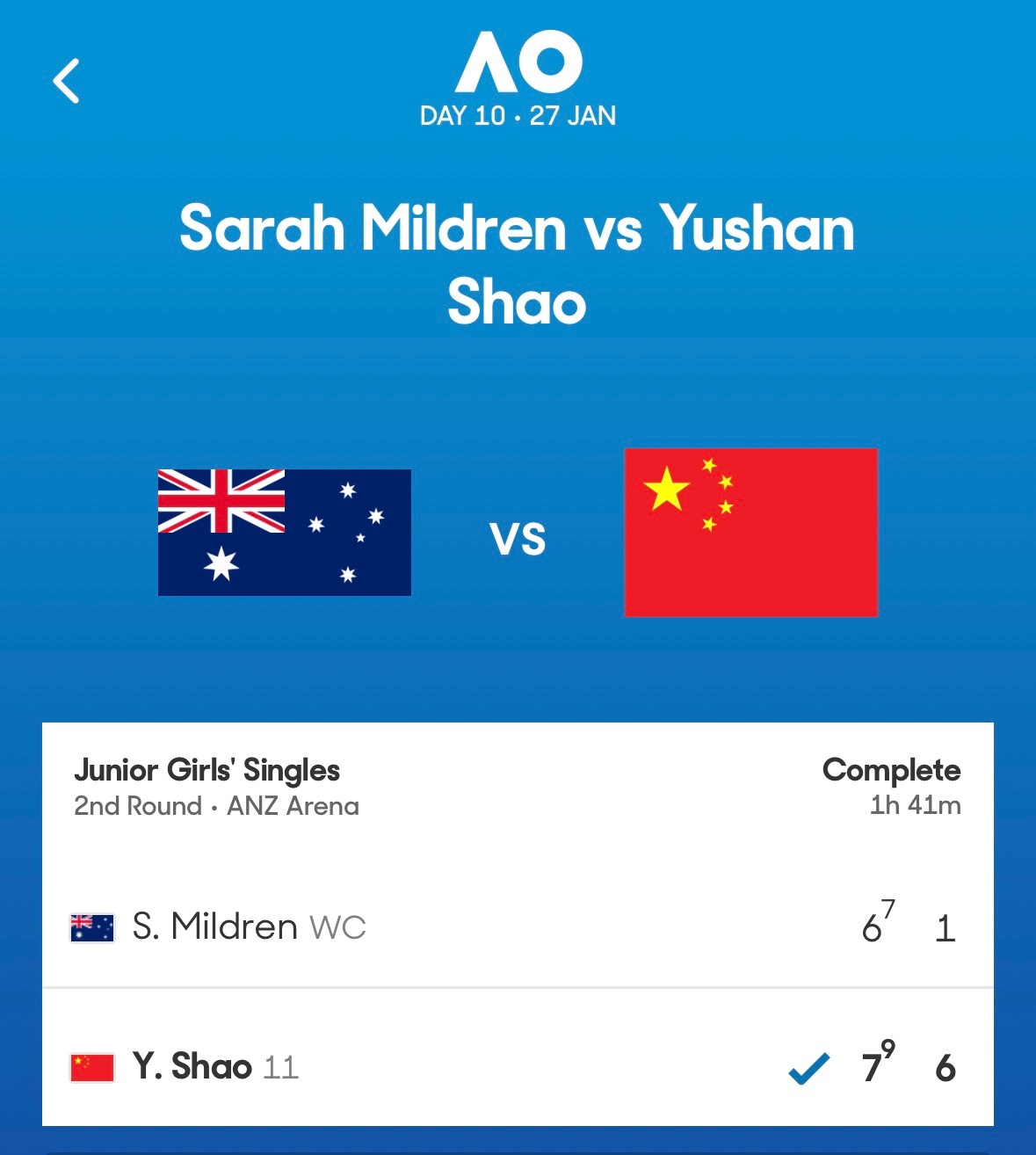 邵羽杉7-6、6-1击败米尔德伦,闯入澳网青少年女单16强,将战普什卡列娃。目前中国已经三人闯入第三轮(另两位:渠依含和张瑞恩),正在打决胜盘的孙心然加油!图这很澳网澳网2026网球