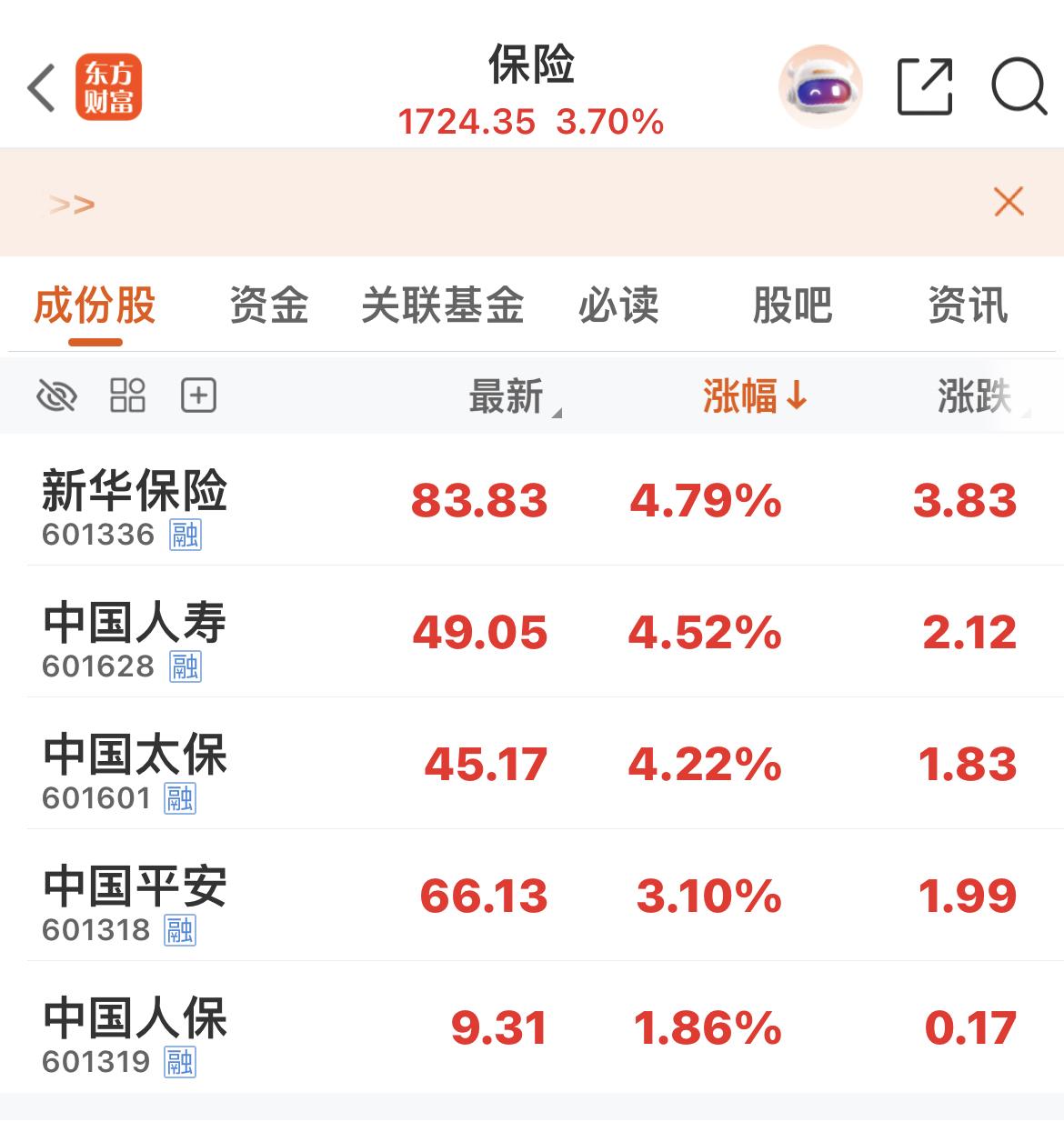 保险板块上涨3.70 %! 新华、人寿、太保涨幅均超4%!
