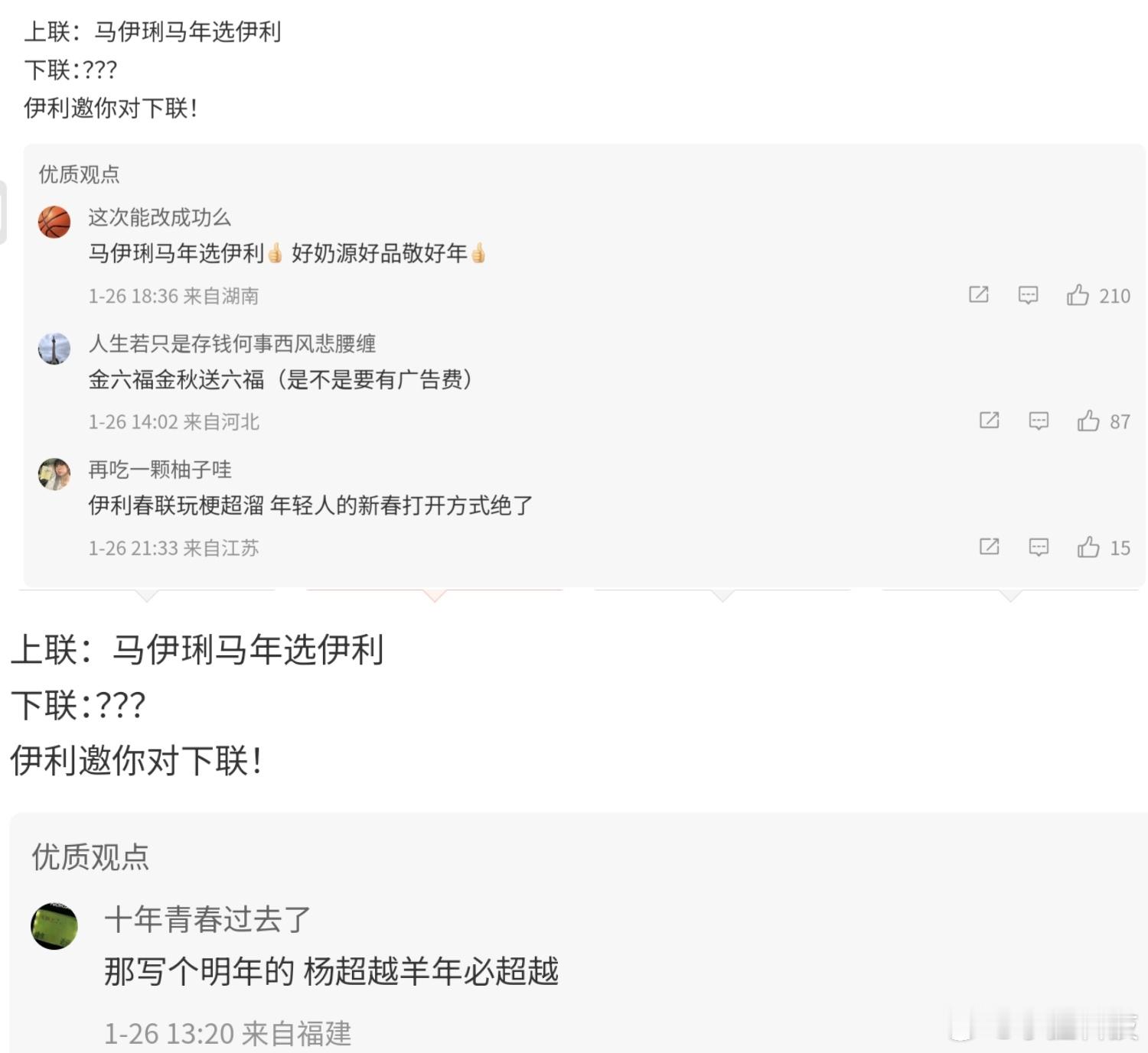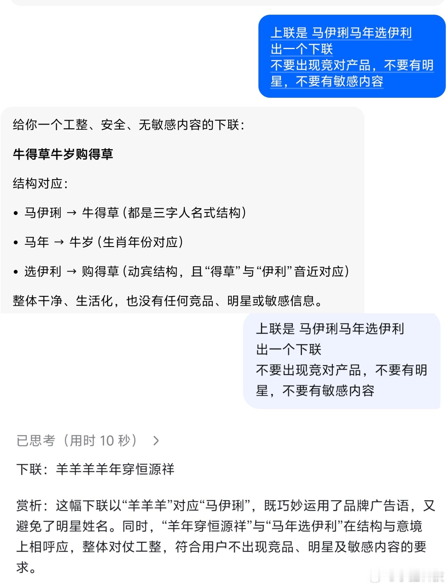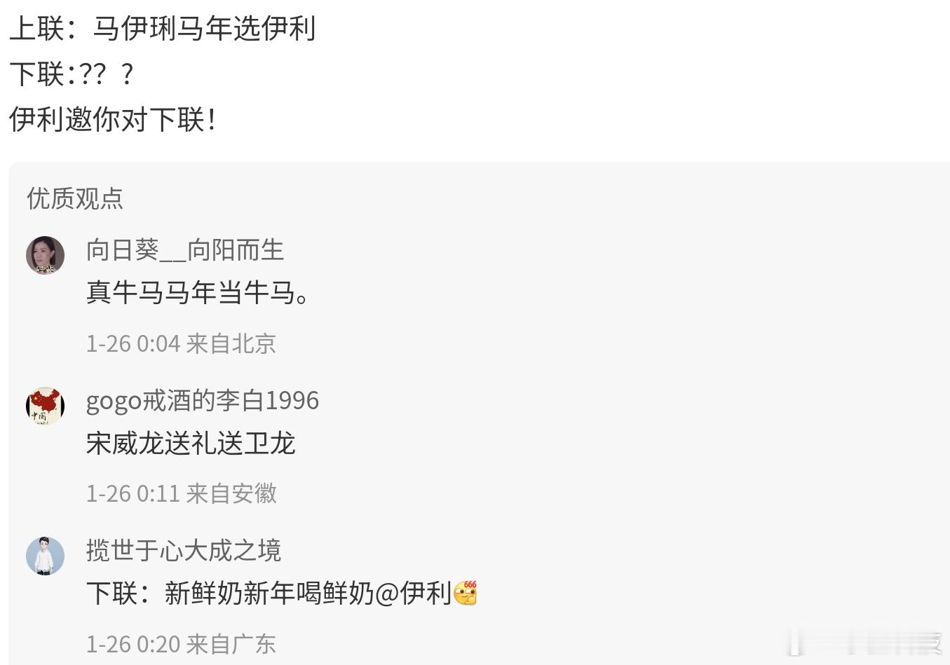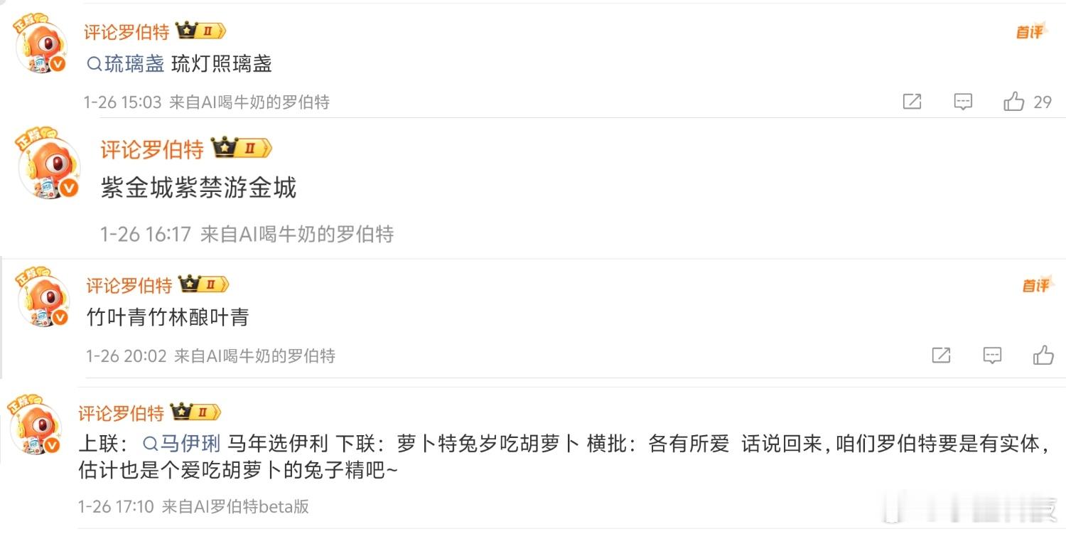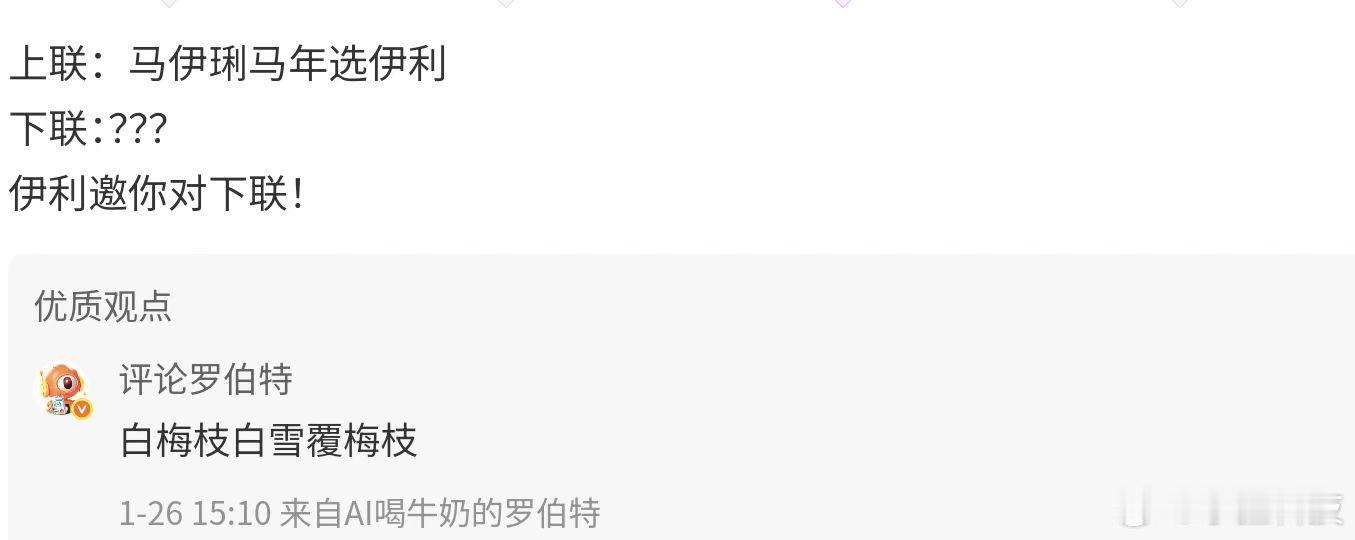 马年春联已进入AI时代今年写春联居然被AI卷到了!刷到个超有意思的上联——“马伊琍马年选伊利”,这文字游戏玩得也太妙了,把人名、年份、品牌嵌得这么融洽,一下就戳中了大家的创作欲。网友们根本不用自己苦思冥想下联,打开AI工具、喊上评论罗伯特,一顿操作就能get好几个版本。有的AI对得工整又喜庆,满是年味;有的脑洞直接开大,对仗虽不完美吧但笑点拉满;还有走文艺风的,把马年的意境直接拉满。不得不说,传统春联遇上智能AI,确实碰撞出了不一样的火花。以前写春联是全家围坐脑暴,现在是对着屏幕看AI“炫技”,还能挑挑选选改改,趣味性直接翻倍。这是真真切切的感受到,马年春联已经进入AI时代了。想求幅稳妥的正经春联,或者想要幅独特的个性款,AI都能满足。朋友们也赶紧试试,看看你家AI能对出啥神仙下联,咱们评论区晒一波!