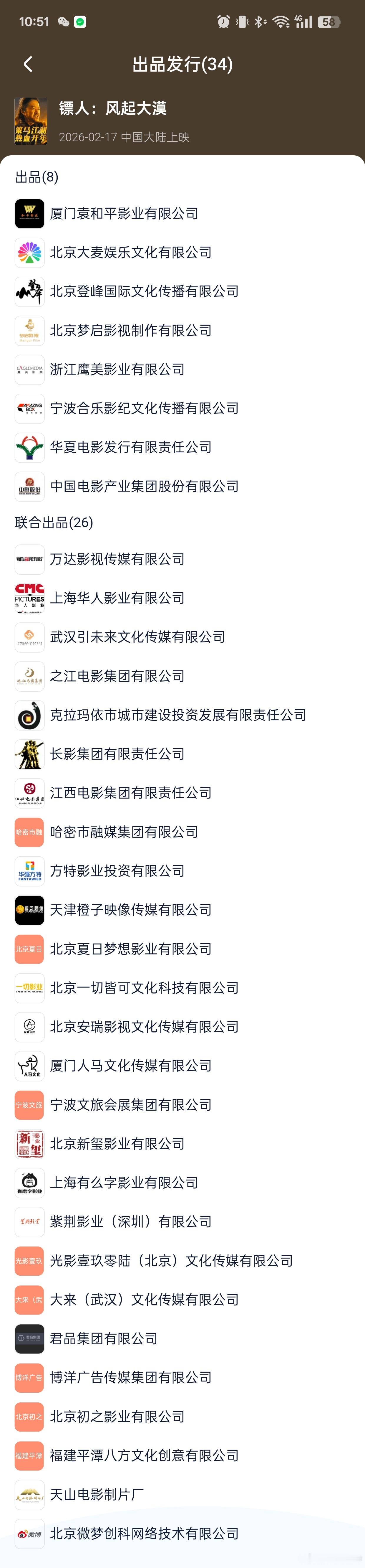 听听温特怎么说春节档电影《镖人》又更新来出品方。这次主出品新增了中影、华夏两个国家队。联合出品新增了之影集团 (浙江电影公司),橙子映像(邓超俞白眉的公司),紫荆文化(央企紫荆文化旗下)等。