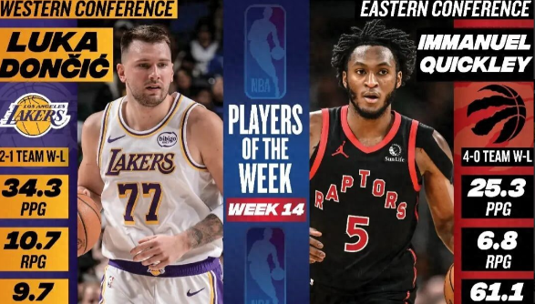1月27日,NBA官方宣布,猛龙队的伊曼纽尔·奎克利和湖人队的卢卡·东契奇当选上周东西部最佳球员。