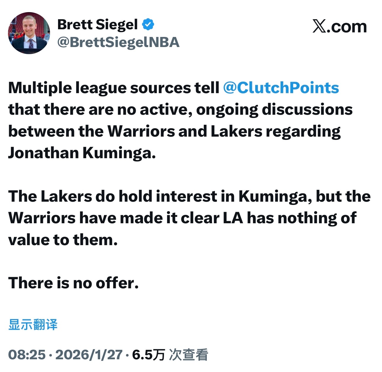 Brett Siegel今天否认了Evan Sidery关于湖人与勇士谈交易的报道:“多位联盟消息人士透露 ,勇士和湖人之间没有就库明加进行任何积极的、正在进行的讨论。湖人确实对库明加感兴趣,但勇士已经明确表示,湖人拿不出有价值的筹码,也没有任何正式报价。”