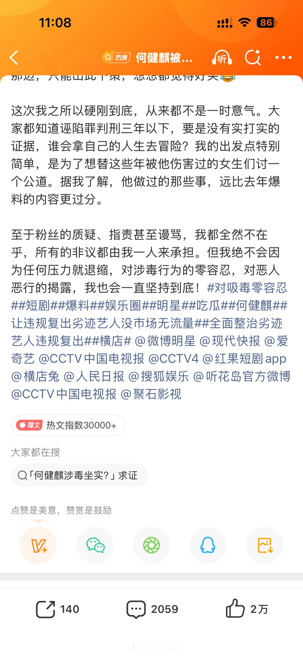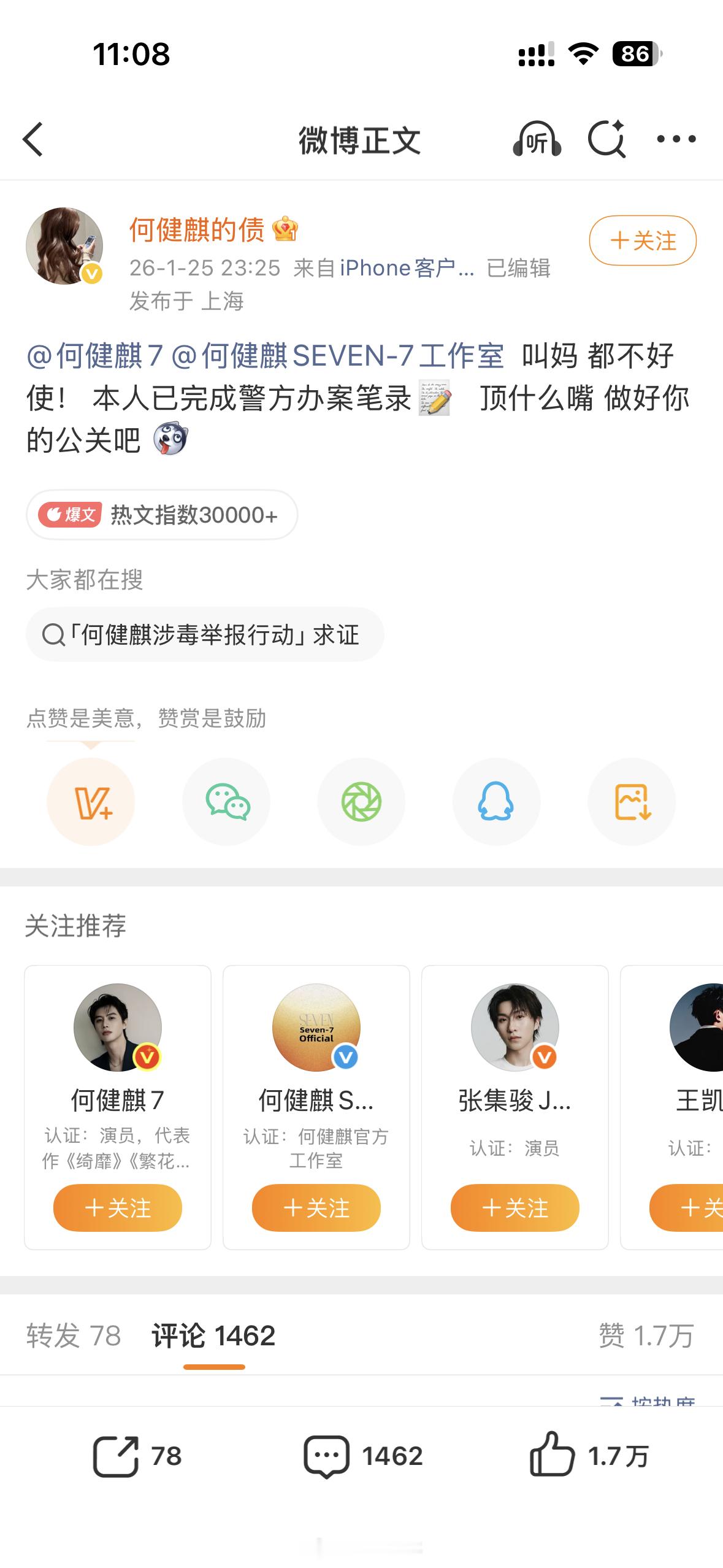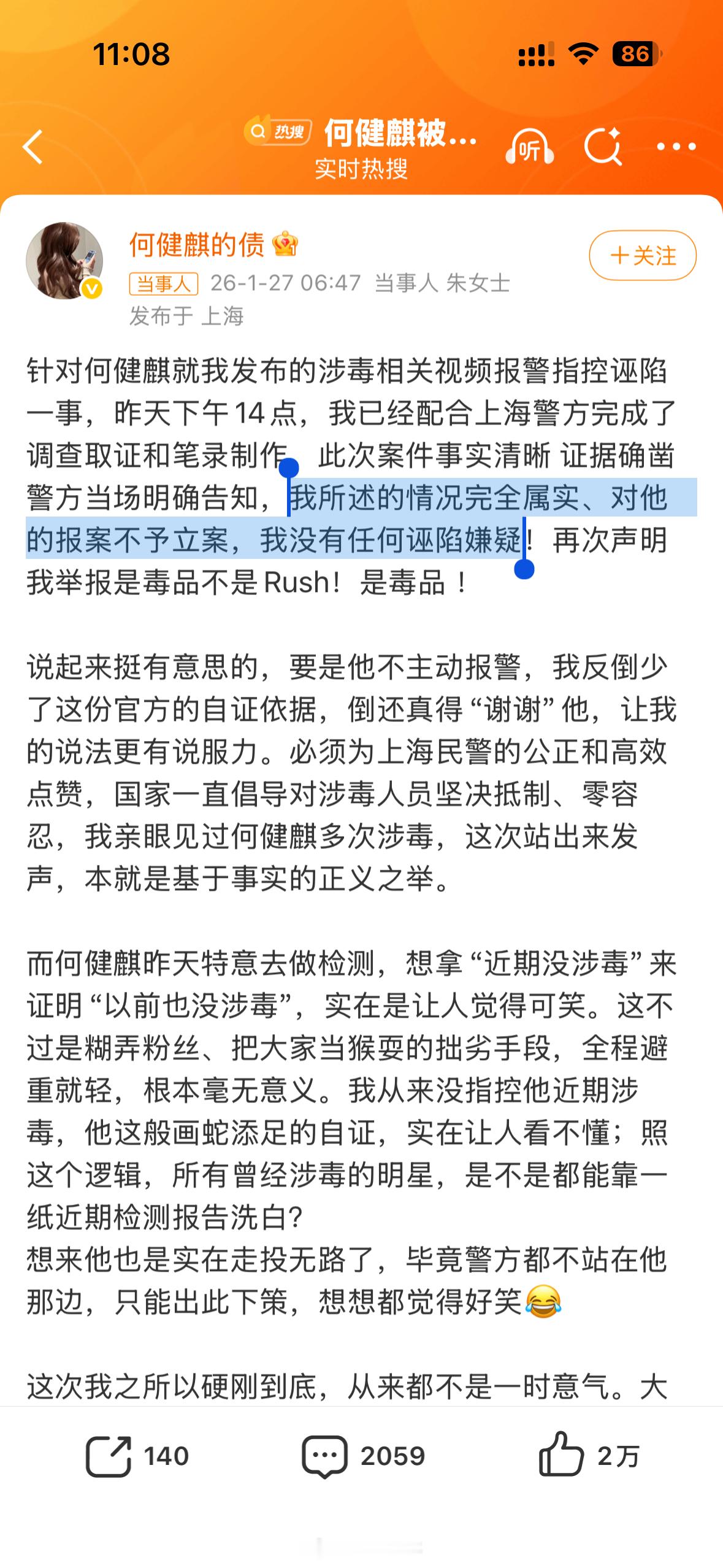 何健麒前女友长文,说自己已经完成了笔录和取证,而且「 警方当场明确告知,我所述的情况完全属实、对他的报案不予立案,我没有任何诬陷」。此外,何健麒前女友还完成了当事人认证,估计是要硬刚了。