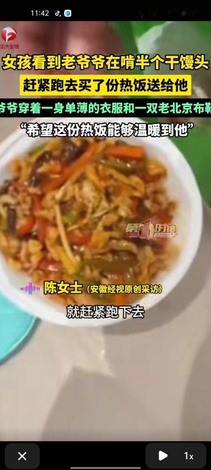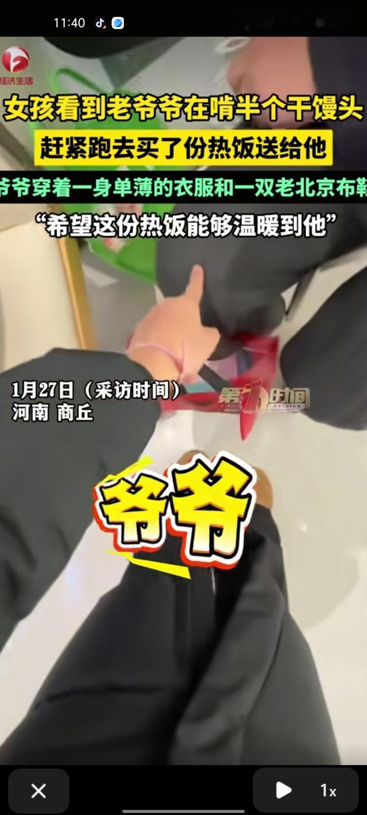 1月24日,商丘市夏邑县。女生看到老爷爷啃半个馒头,衣服穿着单薄,还穿着一双老北京布鞋,这个寒冷的冬天老爷爷肯定冻坏了。随后,她跑下去买一碗热乎饭送给他,希望这碗热饭能给他带来温暖。