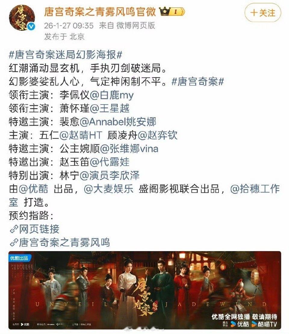 唐宫奇案官宣阵容又是被白鹿惊艳到的一天,看到白鹿在电视剧《唐宫奇案》的预告,隔着屏幕都能感受到的质感啊,白鹿在古偶剧的人生角色又要上新了,这也是白鹿和王星越的再次合作,坐等开播啦!白鹿唐宫奇案质感