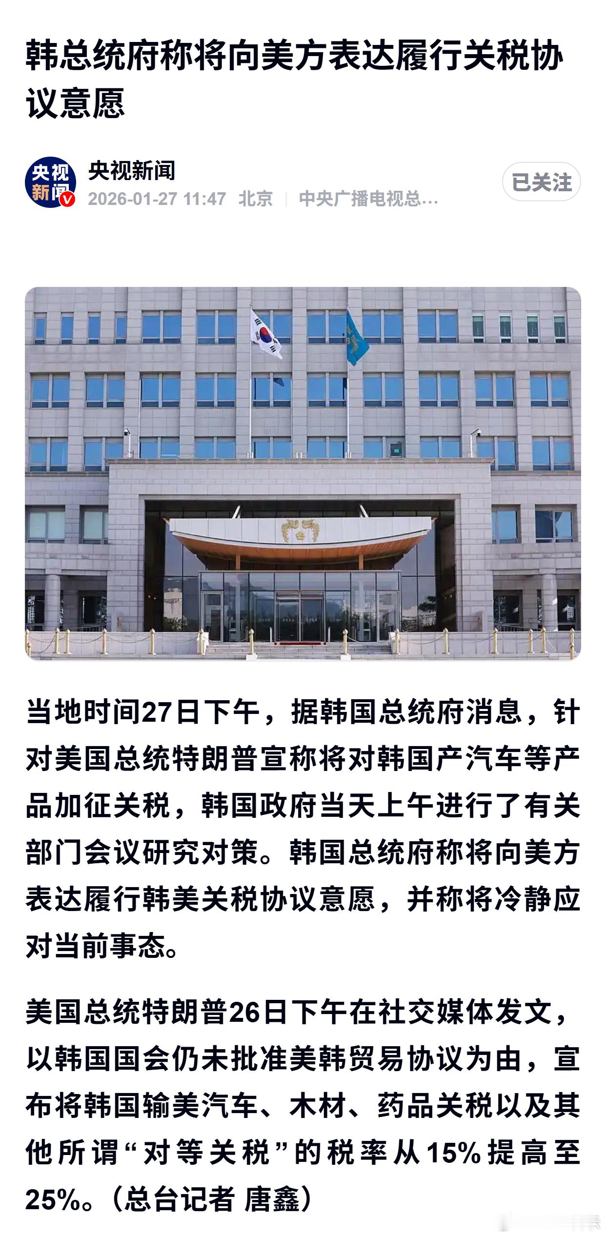 韩总统府称将向美方表达履行关税协议意愿