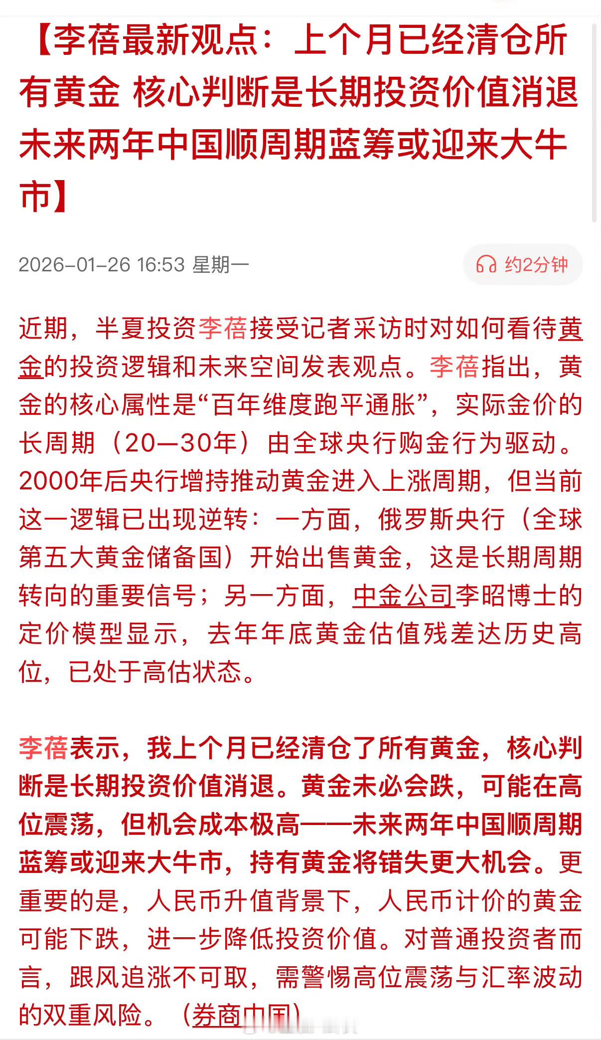 李蓓最新观点:上个月已经清仓所有黄金,核心判断是长期投资价值消退,未来两年中国顺周期蓝筹或迎来大牛市黄金涨到水贝商家都害怕