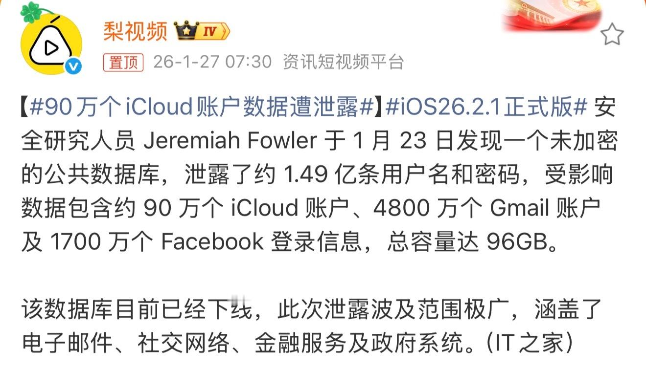 90万个iCloud账户数据遭泄露总共1.49亿条账号密码被曝在未加密数据库里!而且信息还会在黑市流通。所以苹果也没有安全到那个地步….大家赶紧改密码,开双重认证吧!不同平台别用同一个密码!这年头真的稍不注意信息就被人拿捏了!